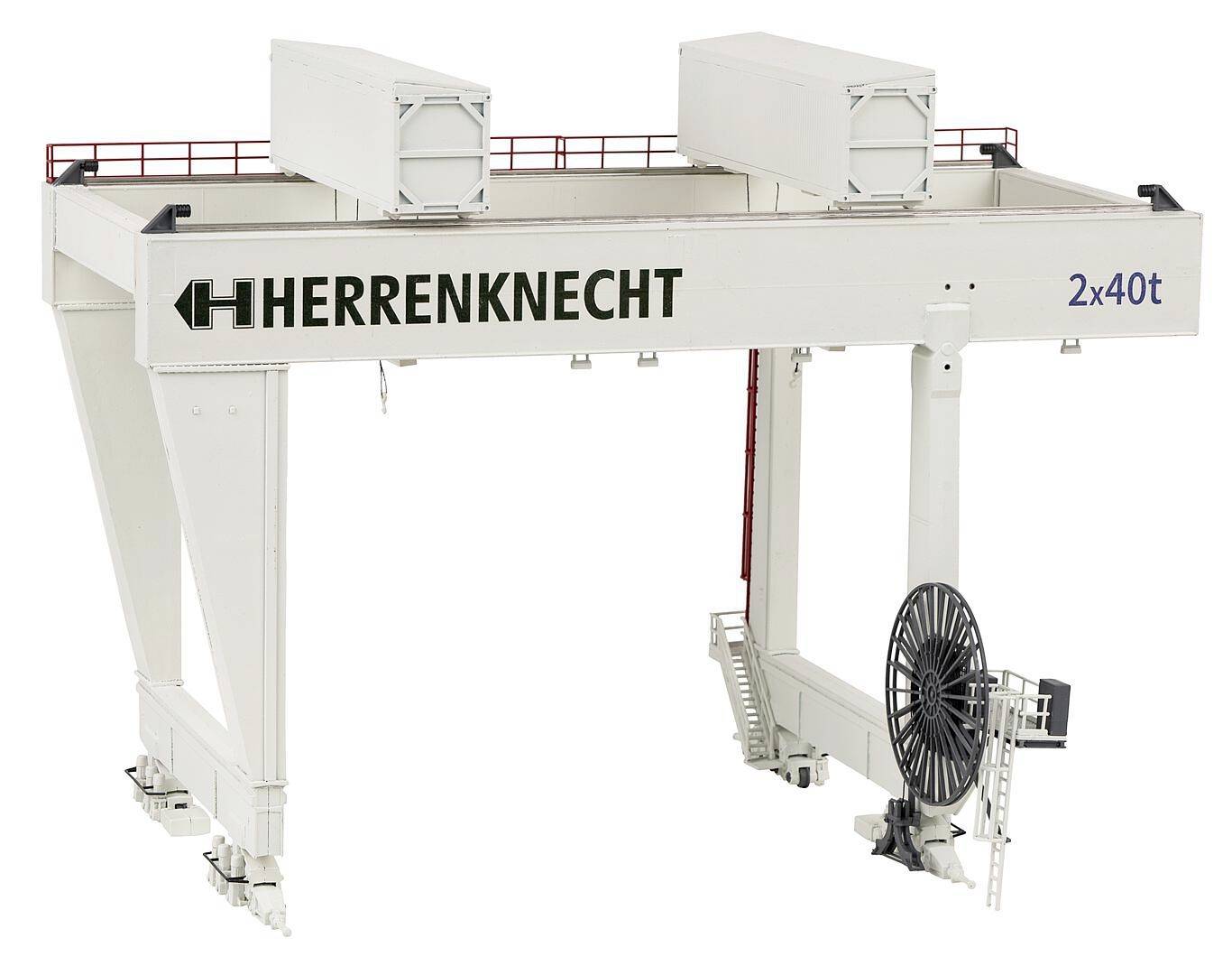 Standmodell eines weißen, schienengebundenen Portalkrans mit Hebezeug und Laufkatze für vertikale und horizontale Hebevorgänge mit schweren Lasten, z. B. für die Montage von Tunnelvortriebsmaschinen auf Tunnelbaustellen. Typisierte Darstellung mit Aufdruck des »HERRENKNECHT«-Schriftzugs. Schienenprofile beiliegend. Modell ohne Funktion.