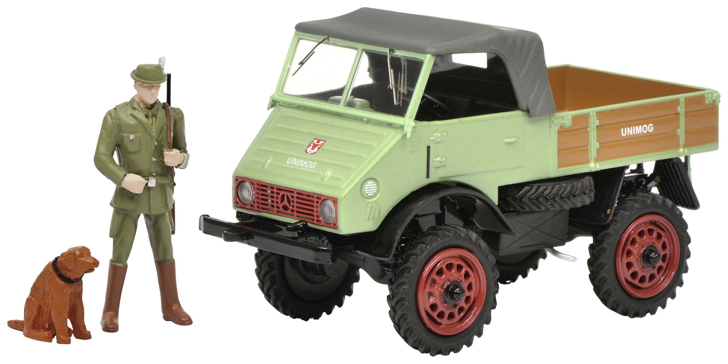 Bereits seit seiner Markteinführung im Jahre 1949 ist der als Universal-Motor-Gerät vorgestellte Unimog auch ein bevorzugtes Arbeitsgerät und Fahrzeug vieler Jäger. Das fein detaillierte Modell des Unimog U401 erscheint nun als attraktives Set mit maßsstabsgetreuer Jäger- und Hunde-Figur im Maßstab 1:43.