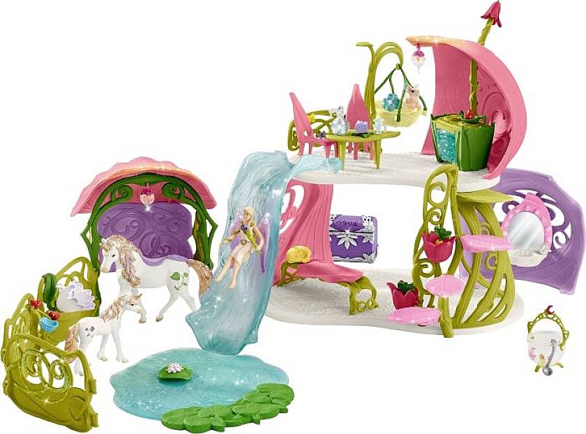 In der Morgensonne erstrahlt das Blütenhaus in sanften Farben der Natur. Du kannst hierher all deine Elfenfreundinnen einladen. Für die Pferde ist genug Platz und Futter im Stall. Hier könnt ihr Geschichten erzählen, träumen oder zu neuen Abenteuern aufbrechen. Die Schleich® Figuren sind alle detailgetreu modelliert und stehen für pädagogisch wertvolles Spielen.