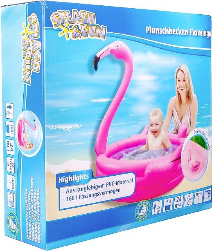 Splash und Fun Planschbecken Flamingo, Durchmesser ca. 100 cm. Mit Bodenablassventil. Ca. 160 Liter Fassungsvermögen. Aus langlebigem PVC. Materialdicke ca. 0,22 mm. Maße aufgeblasen ca. 112x145x100 cm. Für Kinder ab 24 Monaten.