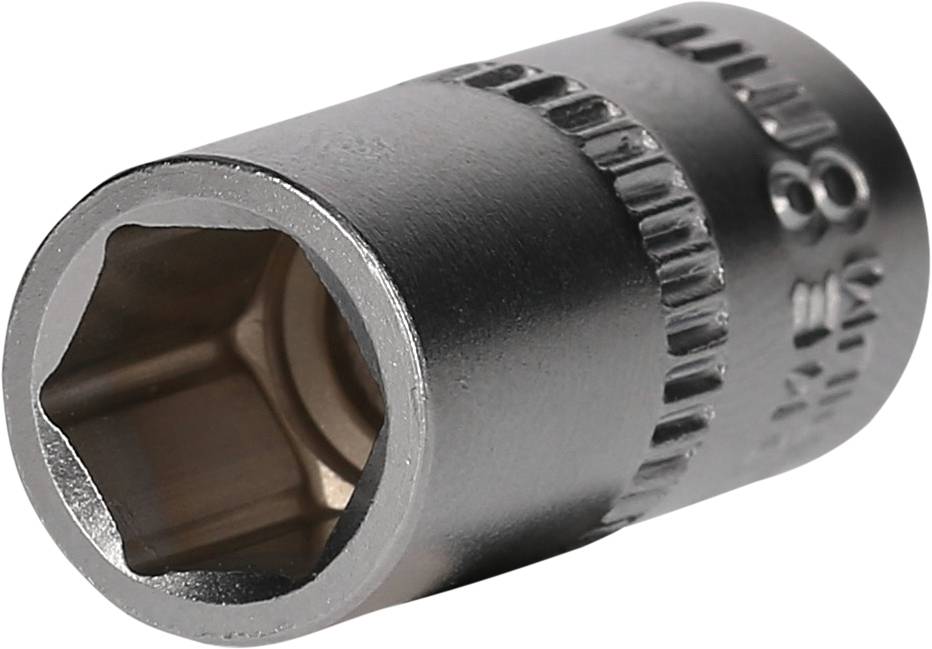 Die BRILLIANT TOOLS Sechskant-Stecknuss BT020936 ist nach DIN 3124 gefertigt. Der kurze metrische Einsatz hat einen 1/4" (6,3 mm) Innenvierkant-Antrieb welcher nach DIN 3120 gefertigt wurde. Die Schlüsselweite des Sechskants ist 8 mm. Die Sechskant-Stecknuss hat eine Gesamtlänge von 25 mm. Die Oberfläche ist an der Antriebsseite und an der Innensechskantseite matt verchromt, diese ist durch eine Längsrändelung getrennt.