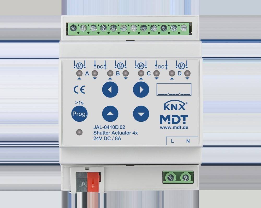 KNX Jalousieaktor 4-fach, 4TE REG, 8 A, 24 V DC. Für 24 V DC Motoren bis 180 W. Mit Sonnenstandsberechnung. Mit Sonnenstandsberechnung. Handbedienung sperrbar und LED Anzeige je Kanal. Betriebsart für Jalousie/Rollladen. Praxisnahe Lüftungsfunktion (Fenster geöffnet/gekippt). Automatische Beschattung/Lamellennachführung mit Sonnenstandsberechnung. Lauf-, Pausen- und Schrittzeit frei einstellbar. Separat einstellbare Verfahrzeiten für Auf/Ab. Tastbetrieb zur genauen Positionierung. Erweiterte 1 Bit Automatikpositionen und Szenenfunktionen. 1 Byte absolute Positionierung für Höhe und Lamelle. Alarm-, Zentral- und Sperrfunktionen. Verhalten nach Alarm und Sperre separat einstellbar. Für 24 V DC Motoren mit 2 Anschlüssen. Integrierte Polwendeschaltung. Einstellbares Verhalten bei Busspannungsausfall/-wiederkehr. Schneller Download der Applikation (long frame support ab ETS 5). 3 Jahre Produktgarantie.