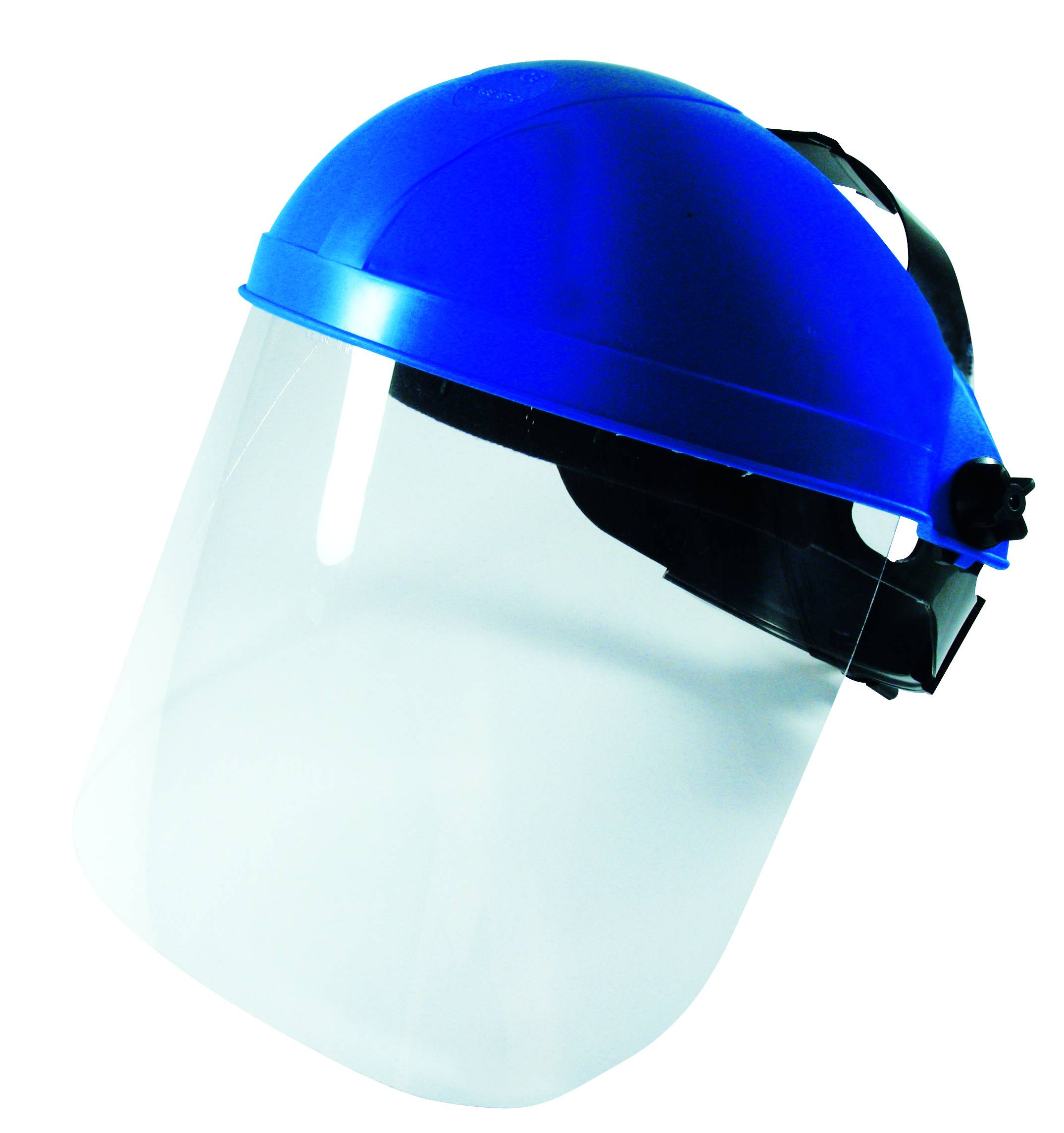 Gesichtsschirm mit zusätzlichem Stirnschutz, der weit über Stirn und Kopf reicht. Sicherer Halt ist durch individuell verstellbare Kopfhalterung gewährleistet.