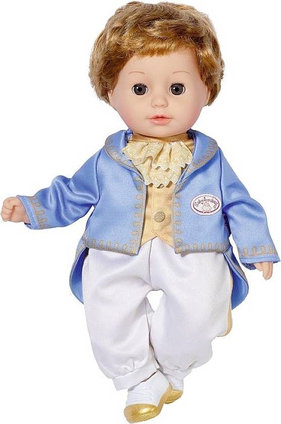 Mit dem kleinen süßen Prinzen hat Prinzessin Annabell endlich einen Partner zum Üben des Königswalzers gefunden. Der 36cm große Junge trägt weiß-goldene Schuhe, mit denen er eine flotte Sohle aufs Parkett legen kann. Die weiße Hose ist seitlich mit einem aerodynamischen Goldstreifen bedruckt. Sein Oberteil ist ein 2in1 aus goldener Weste und royal-blauer Jacke mit angenähtem Spitzenlatz. Das Outfit ist im easy fit Style gefertigt und kann sogar von kleinsten Kinderhänden einfach an- und ausgezogen werden. Die qualitativ hochwertigen Haare sitzen auch bei den wildesten Drehungen perfekt auf seinem Kopf aus Vinyl. Nach der Tanzstunde macht der kleine Prinz immer ein Nickerchen und träumt vom nächsten Ball auf Schloss Babylon. Wenn man den Süßen mit dem weichen Stoffkörper auf den Rücken legt, schließt er die Schafaugen. Baby Annabell Markenspielpuppe Die kleine -Einsteigerversion (36 cm) mit weichem Puppenkörper. Im easy fit Style. Mit Schlafaugen. Animiert Kinder ab einem Jahr behutsam zum (Rollen-)Spiel und setzt erste Anreize zur Entwicklung von Einfühlungsvermögen und Verantwortungsbewusstsein. Baby Annabell Little Sweet Prince mit 2in1 Oberteil, Hose und Schuhen.