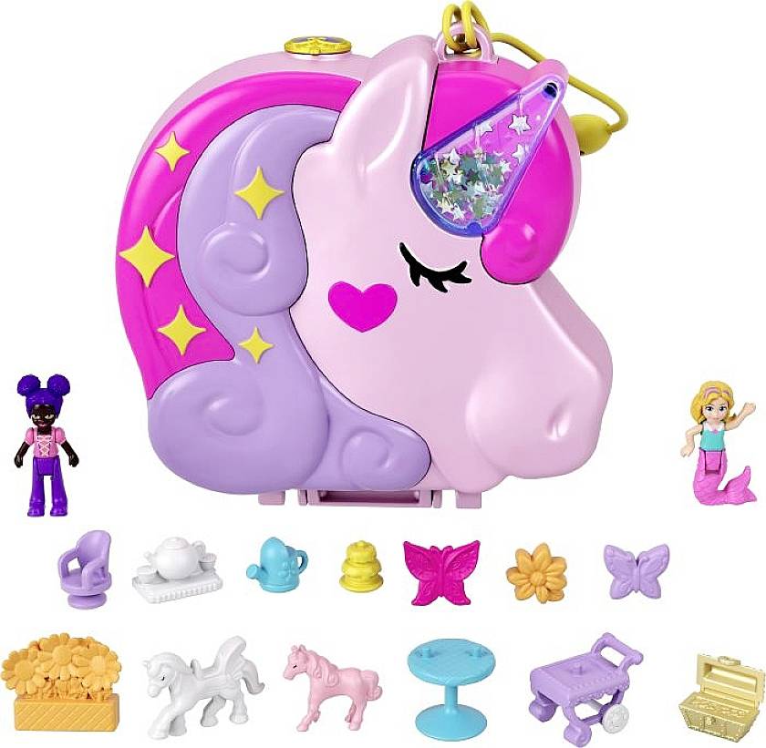 Magische Überraschungen warten mit Polly Pocket! Perfekt zum Spielen zu Hause oder unterwegs lädt diese Einhorn-Zauber Schatulle zur Teeparty im Wald ein, mit Einhorndesign außen und einem durchsichtigen Horn, das mit Glitzer zum Schütteln gefüllt ist. Die Schatulle enthält fünf überraschende Funktionen, 13 Zubehörteile und 2 kleine Puppen. Die folgenden lustigen Aktivitäten laden zum Entdecken ein: Die Pferdeställe lassen sich öffnen (das Zubehör umfasst zwei kleine Einhornfiguren), die Puppen können Spaß auf der Schmetterlingsschaukel haben und die Pilztür lässt sich öffnen. Einige Zubehörteile können an verschiedenen Stellen der Schatulle angebracht werden. Das sorgt für noch mehr Abwechslung beim Spielen! Abweichungen in Farbe und Gestaltung vorbehalten. Tolles Geschenk für Kinder ab 4 Jahren.