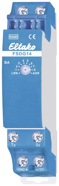 RS485-Bus-Funk-Stromzähler-Datengateway für Zähler mit IR-Schnittstelle IEC 62056-21. 2 Kanäle. Stand-by-Verlust nur 0,4 Watt. Anschluss an den Eltako-RS485-Bus. Querverdrahtung Bus und Stromversorgung mit Steckbrücke. Dieses Stromzähler-Datengateway kann die Daten eines elektronischen Haushaltszählers (eHZ-EDL) mit IR-Schnittstelle gemäß IEC 62056-21 und SML Protokoll Version 1 dem RS485-Bus zur Verfügung stellen. Entweder zur Weiterleitung an einen externen Rechner oder die GFVS-Software. Durch regelmäßiges Aufblinken der grünen LED wird angezeigt, dass das FSDG14 Daten vom Zähler empfängt. Die Wirkleistung, bis zu 4 Zählerstände und die Seriennummer werden übermittelt. Die Seriennummer entspricht den letzten 4 Bytes (hex) der auf dem Zähler aufgedruckten Server-ID. Über das Funk-Antennenmodul FAM14 wird in den Gebäudefunk gesendet. Bezugsdaten werden auf Kanal 1 und Lieferdaten auf Kanal 2 gesendet. Dazu ist es erforderlich, dass von dem FAM14 eine Geräteadresse vergeben wird, wie in der Bedienungsanleitung beschrieben. Bei einer Änderung der Wirkleistung oder eines Zählerstandes wird das betreffende Telegramm sofort gesendet und zyklisch alle 10 Minuten werden alle Telegramme inkl. der Seriennummer gesendet. Mit dem PC-Tool PCT14 kann das FSDG14 ausgelesen werden.
