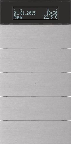 Tastsensor 5fach mit Temperaturregler und Display B.IQ Alu. B.IQ Tastsensor 5-fach mit Temperaturregler und Display (RTR-Display), rahmenlos, fünf Wippen, mit Betriebs-LED, blau und zehn Status-LED, weiß, Display, dunkel mit weiß leuchtender Schrift, mit Demontageschutz. Unterputz-Installation. EIB-Anwendermodul zum Aufstecken auf Busankoppler plus Up über Anwenderschnittstelle (AST). Kombinationsgerät aus Tastsensor und Raumtemperaturregler mit Raumtemperaturschaltuhr sowie zwei Wochenschaltuhren, 5 Wippen zur Bedienung von Gebäudefunktionen in beliebigen Kombinationen, zweizeiliges Display mit zusätzlicher Symbolzeile, mit zwei zusätzlichen integrierten Tasten zum Einstellen und Ablesen von Raumtemperatur, Raumtemperaturschaltuhr, Wochenschaltuhren, Grundeinstellungen sowie Anzeige von Datum, Uhrzeit, Außentemperatur sowie 14 Byte Meldetexten (EIS 15). Display: Beleuchtung Ein, automatische Abschaltung, Schaltung über Objekt. Beschriftung möglich über optionale Beschriftungsfelder, Beleuchtung über Status-LED. Alarmmeldung nach Abziehen vom UP Busankoppler als 1-Bit Schaltelegramm, 1- oder 2-Byte Wertetelegramm, Bedienung sperrbar über Objekt, Tastsensor: Bedienkonzept pro Wippe als 2 Tasten (2 Objekte) oder Wippe (1 Objekt), Tastenhilfe mit Klartextanzeige, Tastenfunktionen: Schalten/Tasten, Dimmen, Einflächenbedienung (Schalten/Tasten, Dimmen, Jalousie) möglich, Jalousie, Wertgeber EIS 6 (1 Byte), Lichtszenenabruf mit/ohne Speicherfunktion, Wertgeber 2 Byte, Betriebsmodus-Umschaltung Reglerbetrieb, Schaltuhr-Bedienung. Wippenfunktionen: Schalten, Dimmen, Jalousie jeweils mit/ohne Einflächenbedienung, Betriebsmodus-Umschaltung für Reglerbetrieb. Raumtemperaturregler: Einzelraum-Temperaturregelung, Erfassung der aktuelle Raumtemperatur und Verarbeitung zu einer Stellgröße. Reglerbedienung Tasten links und rechts des Displays: Betriebsmodusumschaltung (Komfort-, Standby-, Nacht-, Frost/Hitzeschutz-Betrieb), Temperatur-Sollwerte. Betriebsarten: Heizen, Kühlen bzw. Heizen und Kühlen, Grund- und Zusatzheizen/Kühlen bzw. Grund- und Zusatzheizen und Kühlen, Regler abschaltbar (Taupunktbetrieb) bzw. Regler oder Bedienung des Reglers sperrbar, Ventilschutzfunktion. Regelungsarten: Stetige PI-Regelung, schaltende PI-Regelung (PWM) schaltende 2-Punkt-Regelung (Ein/Aus), Präsenztaste zur Komfortverlängerung parametrierbar, Temperaturerfassung über internen und/oder externen Fühler (Mittelwertbildung möglich), Stellgrößenobjekte invertierbar, Meldeobjekte für Heizen und Kühlen, Objekt für Reglerstatus, Voreingestellte Regelparameter für gängige Heiz- bzw. Kühlkörper, Separates Fensterkontakt-Objekt, Raumtemperaturschaltuhr: Zeitabhängige Verstellung der Betriebsmodi Komfort-, Standby-, Nacht-Betrieb, Wochenprogramm, max. 28 Schaltzeiten, Sperrung über Objekt. Wochenschaltuhren: Funktion Schalten, Wertgeber 1 Byte, Lichtszenen-Nebenstelle, max. 14 Schaltzeiten, Sperrung der Schaltuhren über Objekt.