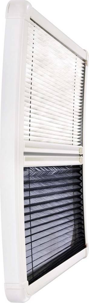 Diese Kombination aus einfach plissierter Verdunkelung und Fliegengitter ist speziell für den Einsatz mit Dometic S7P Fenstern vorgesehen. Die beiden Gitter können miteinander verbunden und mit nur einer Hand in die gewünschte Position gebracht werden.
