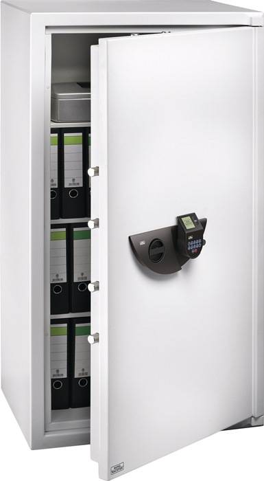 Office-Line. Drei unterschiedliche Sicherheitsstufen. Zwei verschiedene Schließsysteme. Serienmäßig in Lichtgrau (RAL 7035) · Bedienarmatur in Schwarz abgesetzt. Griffschale für bequemes Öffnen in die Armatur integriert. Außen liegendes Scharnier für weiten Öffnungswinkel. Serienmäßig vorgerichtet für Bodenverankerung · mit Befestigungsmaterial, eine Bodenbohrung · mittig angeordnet (optionale Rückwandverankerung gegen Aufpreis möglich). Typgeprüfte und vom ECB?S überwachte Sicherheit. Feuergeschützt · mit umlaufendem Feuerfalz. Zertifizierter Einbruchschutznach EN 1143-1. Korpus und Tür doppelwandig. Stabile 3-seitige Verriegelung durch 28 mm starke Rundbolzen · zusätzlichestarre Rundbolzen als Hintergreifriegelan der Bandseite. Serienmäßig vorgerichtet für Bodenverankerung · mit Befestigungsmaterial · eine Bodenbohrung mittig angeordnet. Auf Wunsch können die Wertschutzschränke Office-Line mit Widerstandsgrad I und II auch mit Rückwandbohrunggeliefert werden (optionale Rückwandverankerung gegen Aufpreis möglich). Ordnertiefe · Fachböden verstellbar. Sicherheitsplus: nicht rücksetzbares, doppeltes Notverriegelungssystem innerhalb der Türmechanik Ausführung E FP SecuTronic Programmierbares elektronisches Zahlenschloss mit Fingerprint-Modul. ECB·S zertifiziert · Klasse B. Grafik-Display mit 1 Admin-Code,bis zu 9 Benutzer-Codes und bis zu 20 Fingerprints. Zeitfunktionen und Rechtevergabe. Inkl. vier Batterien Mignon LR 06 AA. Die Schlossarmatur steht 50 mm vor. Ausführung K SecuSafeUmstellbares gepanzertes Hochsicherheits-Doppelbartschloss. VdS-geprüft · Klasse 2. ECB·S-zertifiziert EN 1300 · Klasse B. Zehn Zuhaltungen · mit Schließzwang. 50 Millionen verschiedene Schließungen. Sicherheitsplus bei Schlüssel-Verlust: sofortumstellbar auf eine neue Schließung! Die Schlossarmatur steht 25 mm vor. Werksseitig mit zwei Schlüsseln. Typgeprüfte und vom ECB?Süberwachte Sicherheit. Feuergeschützt · mit umlaufendemFeuerfalz. Zertifizierter Einbruchschutz nachEN 1143-1. Korpus und Tür doppelwandig. Stabile 3-seitige Verriegelung durch28 mm starke Rundbolzen · zusätzlichestarre Rundbolzen als Hintergreifriegelan der Bandseite. Serienmäßig vorgerichtet für Bodenver-ankerung · mit Befestigungsmaterial · eine Bodenbohrung mittig angeordnet.Auf Wunsch können die Wertschutz-. schränke Office-Line mit Widerstands-grad I und II auch mit Rückwandbohrunggeliefert werden (optionale Rückwand-verankerung gegen Aufpreis möglich). Ordnertiefe · Fachböden verstellbar. Sicherheitsplus: nicht rücksetzbaresNotverriegelungssystem innerhalb derTürmechanik. Ausführung E FP SecuTronicProgrammierbares elektronisches Zahlenschloss mit Fingerprint-Modul. ECB·S zertifiziert · Klasse B. Grafik-Display mit 1 Admin-Code,bis zu 9 Benutzer-Codes und bis zu 20 Fingerprints Weitere technische Eigenschaften: · Türhöhe: 1386mm · Türbreite: 720mm · Anzahl Sperrbolzen: 8
