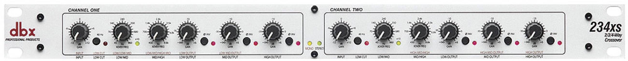 Der dbx 234XS ist eine aktive 4-Kanal Frequenzweiche zur präzisen Anpassung des Frequenzgangs an Lautsprecher. Konstruktionsbedingt können Lautsprecher (Hoch- und Tieftöner) nur einen begrenzten Frequenzbereich übertragen. Die Frequenzweiche teilt deshalb das Audiosignal in unterschiedliche Frequenzbereiche auf. Diese werden dann an den jeweiligen Lautsprecher weitergeleitet, der diesen Frequenzbereich am besten wiedergeben kann. Durch die Anpassung verbessert sich der Gesamtklang des Lautsprechersystems. Die Lautsprechermembrane schwingen präziser, Verzerrungen und Überbetonungen von Frequenzen werden reduziert. Zur Absenkung tiefer Frequenzen, die nicht übertragen werden können, hat der dbx 234XS einen Low-Cut Filter. Die Frequenzweiche dbx 234XS lässt sich 3-Kanal Stereo, 2-Kanal Stereo oder 4-Kanal Mono betreiben. Für den Anschluss eines Subwoofers (mono) kann der Subwoofer-Ausgang summiert werden. Alle anderen Ausgänge können separat geregelt, in der Phase umgeschaltet oder stummgeschaltet werden. Die symmetrischen Ein- und Ausgänge des dbx 234XS haben XLR-Buchsen.