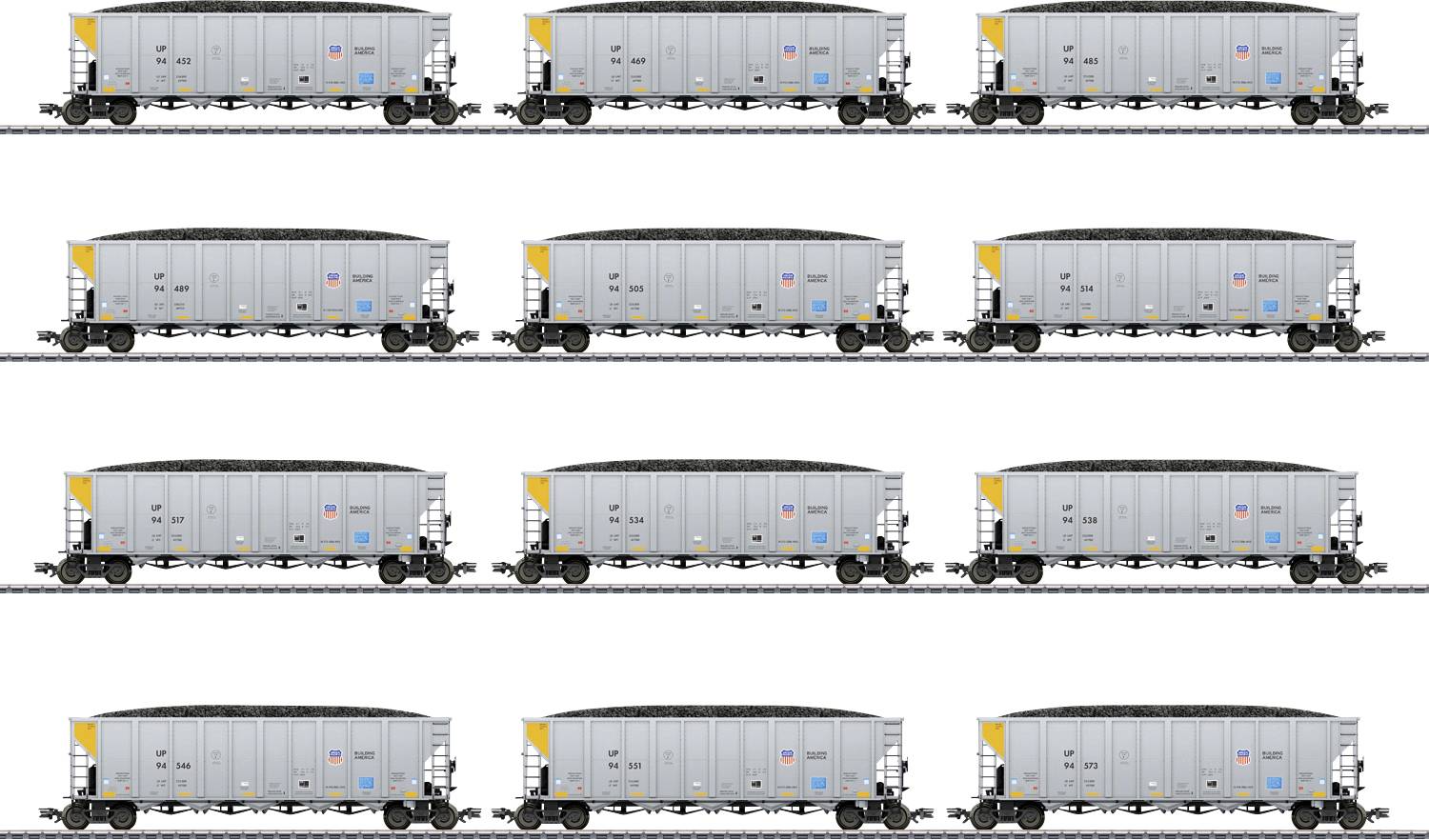 Vorbild: Zwölf Kohletransportwagen, sogenannte Hopper Cars, der Union Pacific Railroad (UP). Ausführung mit fünf Entladeeinrichtungen am Wagenboden. Aktueller Betriebszustand.