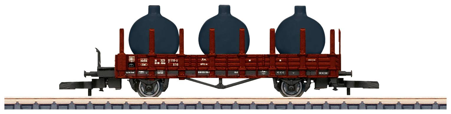 Vorbild: Rungenwagen mit Bremserbühne Bauart Kklm 431 (ex R 10) der Deutschen Bundesbahn (DB). Einsatz zum Transport von doppelwandigen Ölbehältern, im Zustand der Epoche IV.