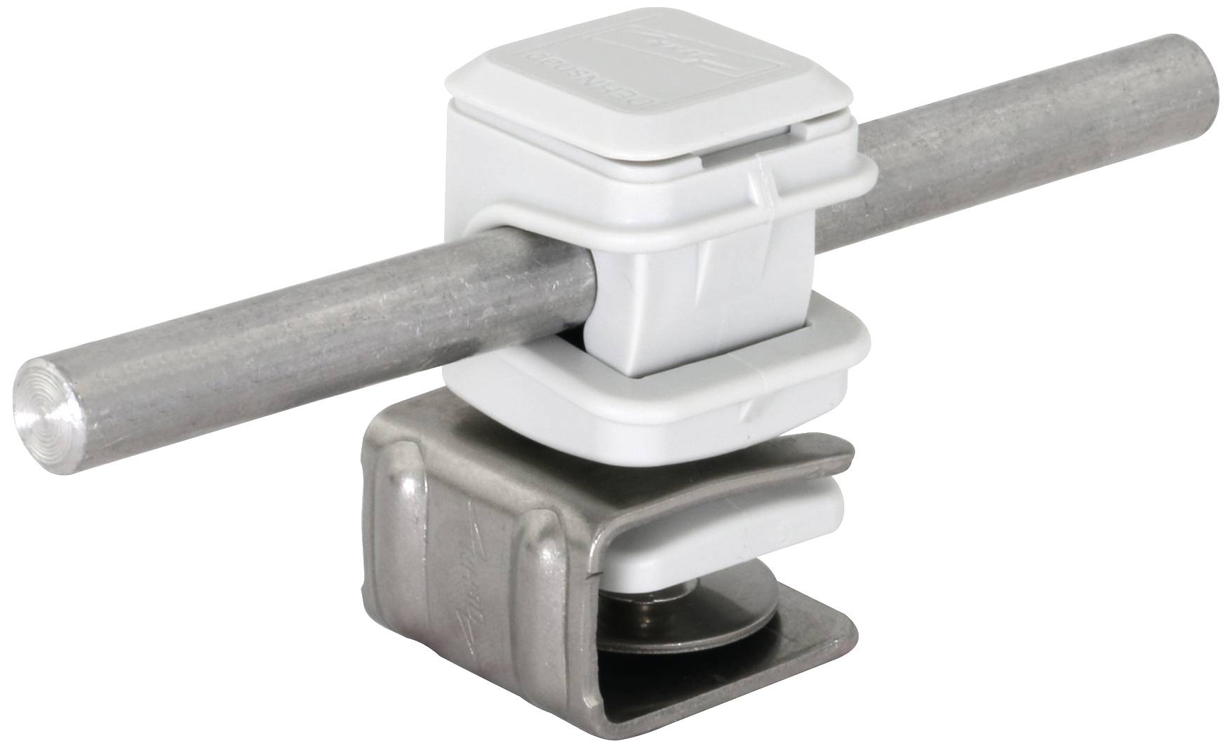Dachleitungshalter PLATTENsnap zur Befestigung von Fang- und Ableitungen für Dachflächen. Ausführung mit Klemmtechnik zum Befestigen an überlappenden Konstruktionen, mit Leitungshalter DEHNsnap, lose Leitungsführung, aus wetterbeständigem Kunststoff, UV-stabilisiert und halogenfrei.