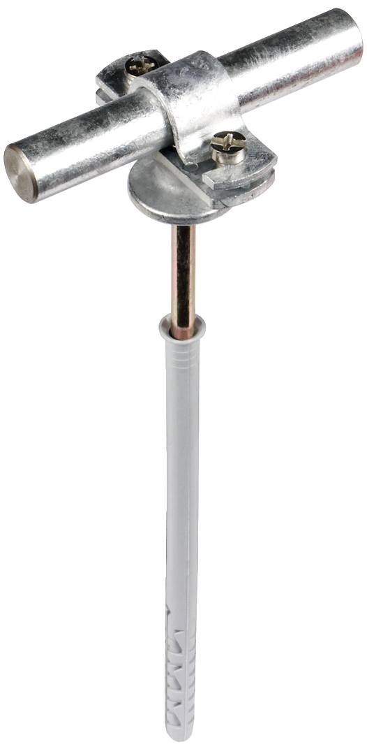 Stangenhalter mit geschlitztem Überleger und Abdeckbund, zum Befestigen von Fang- und Erdeinführungsstangen Rd 16 mm, an Wänden mit Wärmedämm-Verbundsystem. Ausführung mit Zweischrauben-Überleger und fester Leitungsführung.