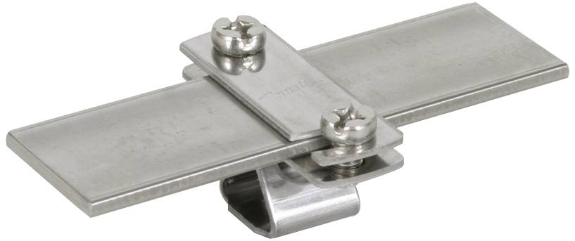 Flachbandhalter DEHNhold mit geschlitztem Überleger, zum Befestigen von Flachleitern. Einsetzbar für verschiedene Werkstoffe z. B. Al, NIRO, St/tZn und Cu, feste Leitungsführung. Ausführung mit Innengwinde.