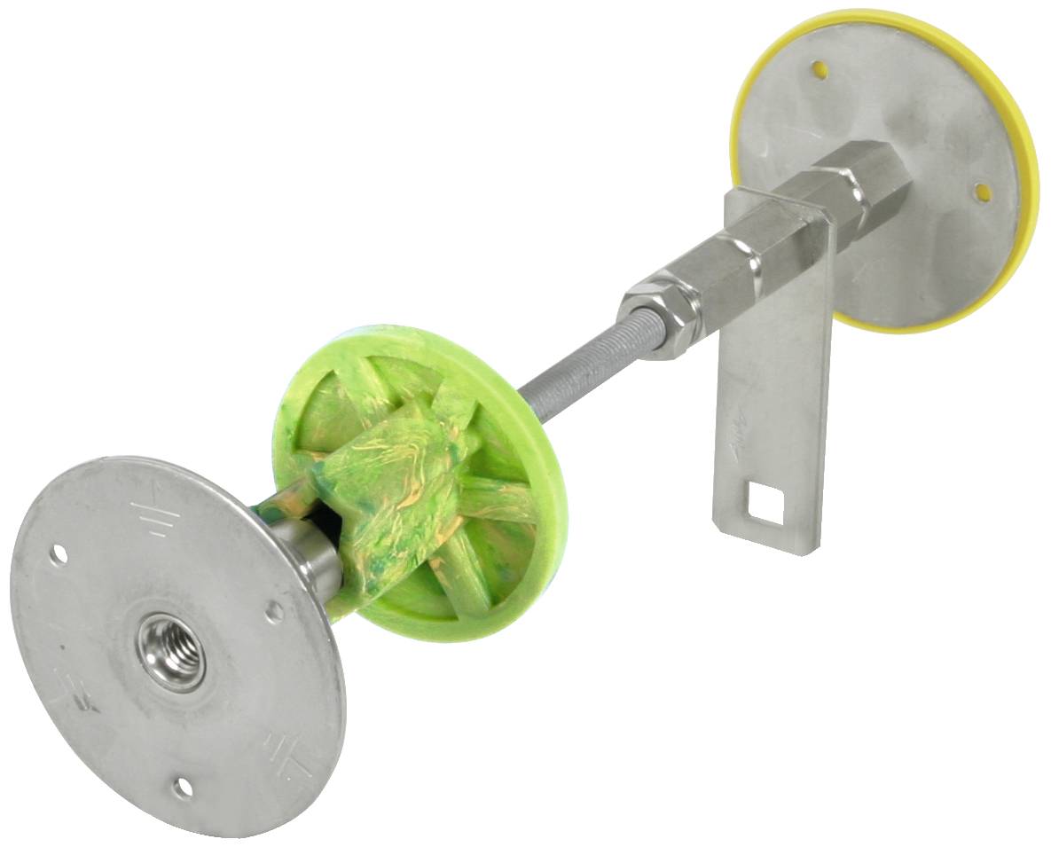 Druckwasserdichte Wanddurchführung für Weiße Wanne, zur druckwasserdichten Durchführung der Erd- / Potentialausgleichsleiter durch Betonwände, verstellbar mit Gewindestange M10. Ausführung für den Schalungseinbau mit Wassersperre und Doppelgewinde M10 / 12. Inkl. Anschlussstück (St/tZn Abm. 30 x 4 mm) mit Vierkantloch für den Anschluss mit Klemmbock bei Rundleitern oder Kreuzstück bei Flachbändern.