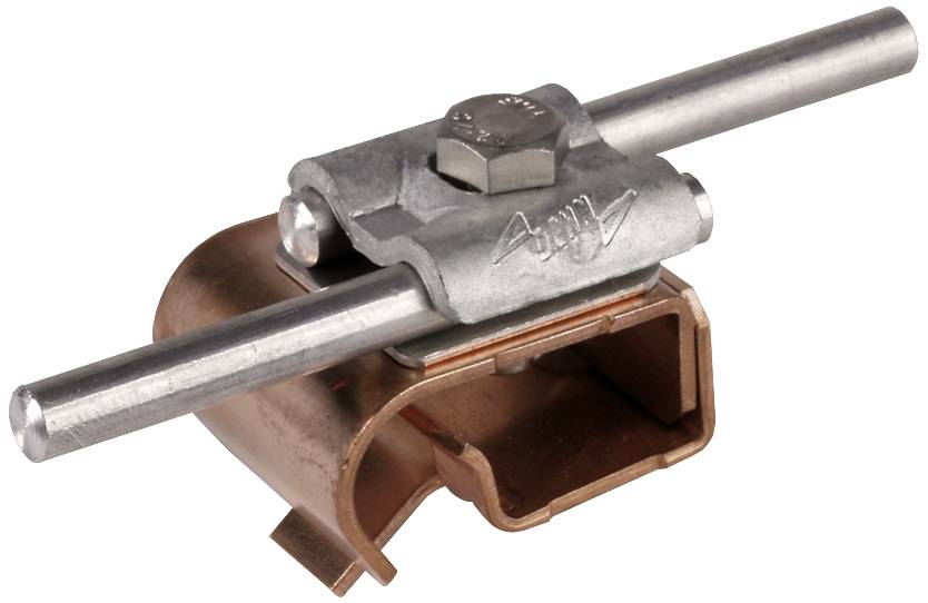 Dachrinnenklemme nach DIN EN 62561-1, zum Verbinden von Rundleitern dem Wulst der Dachrinne. Ausführung Zweimetall für Dachrinnen Cu mit Doppelüberleger (St/tZn) und Zwischenplatte.