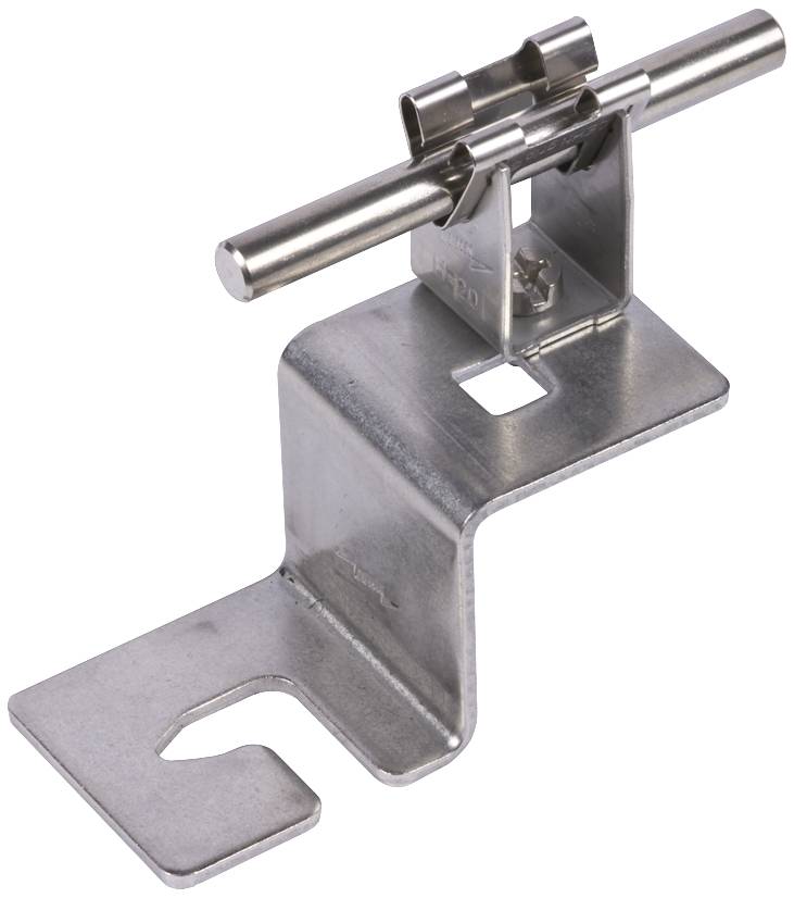 Dachleitungshalter für die Befestigung von zusätzlichen Fangeinrichtungen wie Fangleitungen auf Metalldächern. Ausführung für Trapez-Dächer zum Einhängen in die Befestigungsschrauben des Daches, mit Leitungshalter DEHNgrip, lose Leitungsführung.