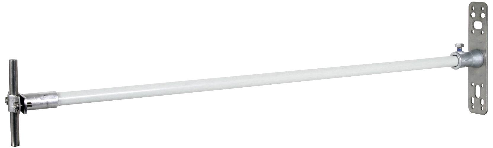 Distanzhalter für Leitungen zur Einhaltung des Trennungsabstandes nach DIN EN 62305-3 (VDE 0185-305-3). Distanzstab aus glasfaserverstärktem Kunststoff (GFK) D16 mm, UV-stabilisiert, Farbe lichtgrau, Materialfaktor km= 0,7. Ausführung mit Leitungshalter (feste Leitungsführung) und Befestigungsplatte.