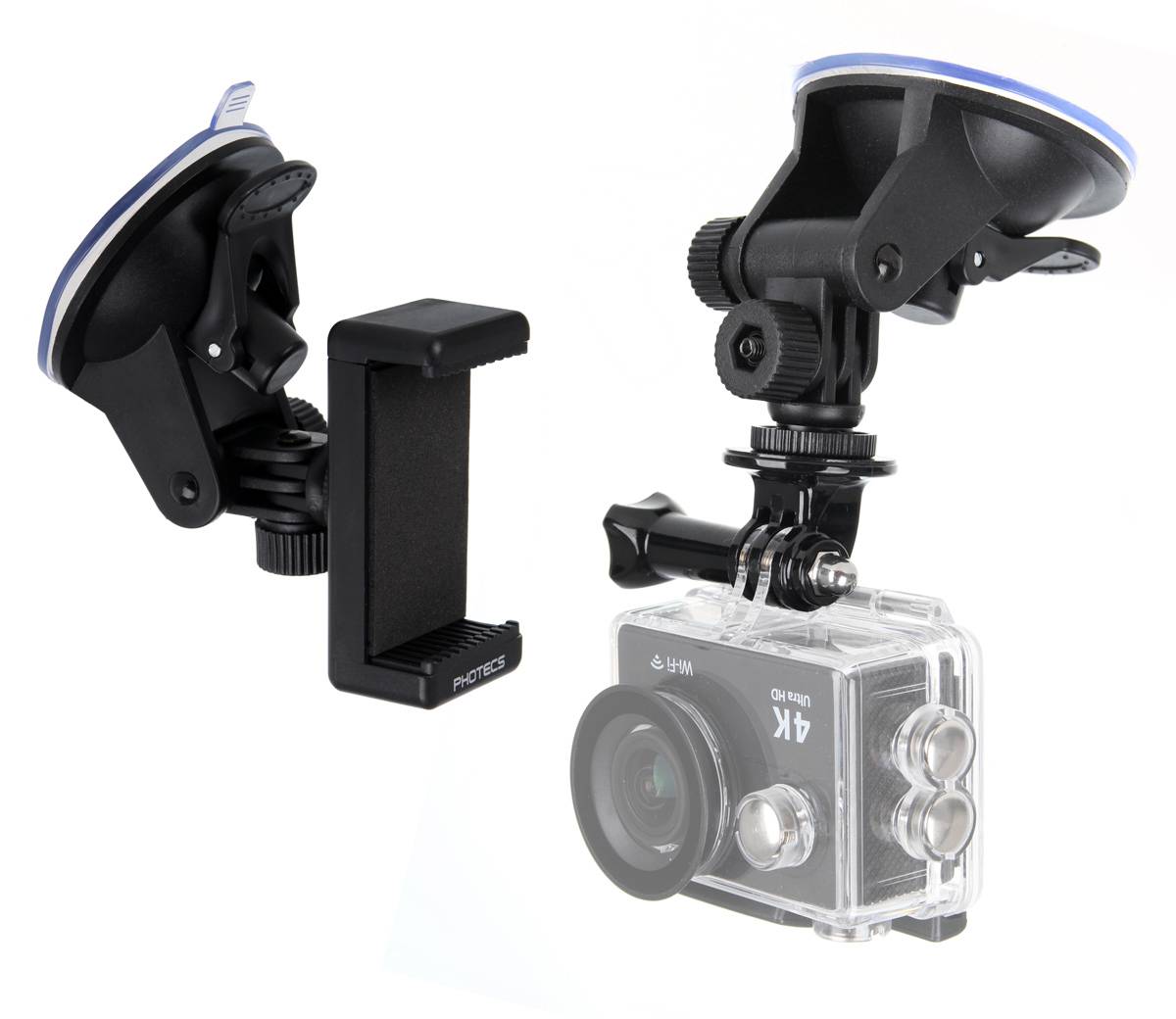 Die abnehmbare, gummierte Klemmvorrichtung ist geeignet für Geräte von 55 bis 85 mm. Alternativ können Geräte mit 1/4" Stativbuchse direkt an die Saugnapf-Halterung montiert werden. Ein Anschlußadapter für Dash Cams ist im Lieferumfang enthalten.