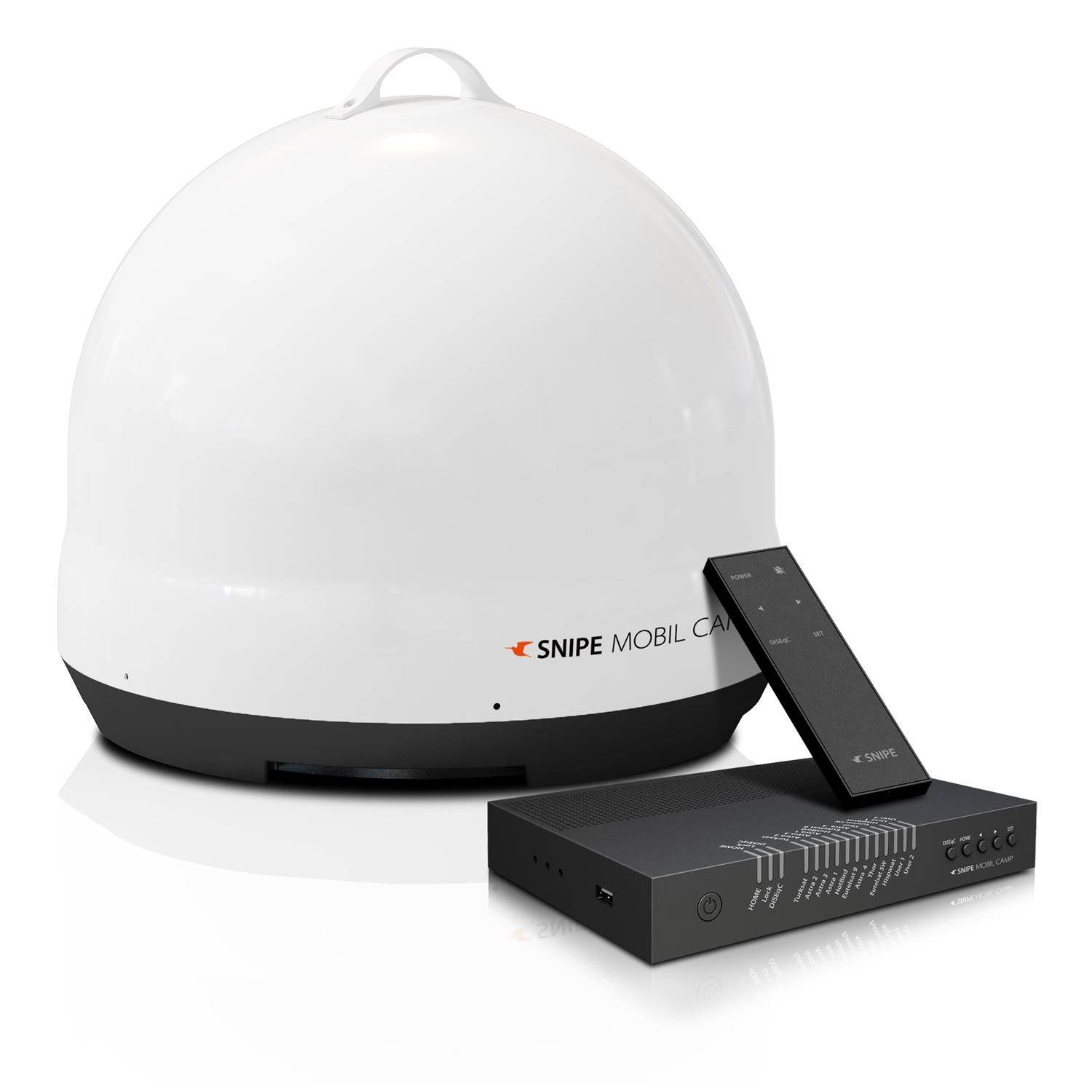 Die automatische Satellitenantenne für Jedermann. Die kompakte kleine Bauform macht die Selfsat Snipe Mobil Camp zum idealen Begleiter auf Reisen oder beim Camping. Der doppelte Diebstahlschutz mit Alarmsystem erlaubt Ihnen die Antenne selbst auf Campingplätzen aufzustellen. Alle gängigen Satelliten sind bereits vorprogrammiert, so dass Sie einfach per Fernbedienung auswählen was Sie sehen möchten.Satelliten-System mit automatischem Positionierer unter einer edlen Kunststoffhaube.