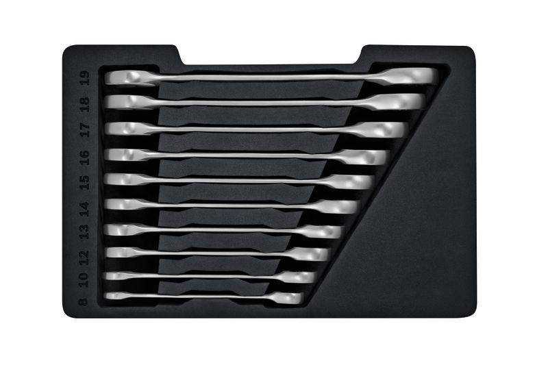 Ringmaulratschenschlüssel Maulschlüssel-Set, 10-tlg. Perfekt für enge Stellen äußerst vielseitiges, 10-tlg. Maulschlüssel-Set. Perfekte Maulringratschenschlüssel für enge Stellen, da die zahnlose Ratsche nur einen Rückschwenkwinkel von weniger als 1 Grad erfordert. Jeder einzelne Schlüssel kombiniert einen Gabelschlüssel mit einem Ring-Ratschenschlüssel in einem einzigen Werkzeug. Hergestellt aus Chrom-Vanadium-Stahl mit gehärtetem Zwölfkantring für zusätzliche Festigkeit und hohe Langlebigkeit. Karton