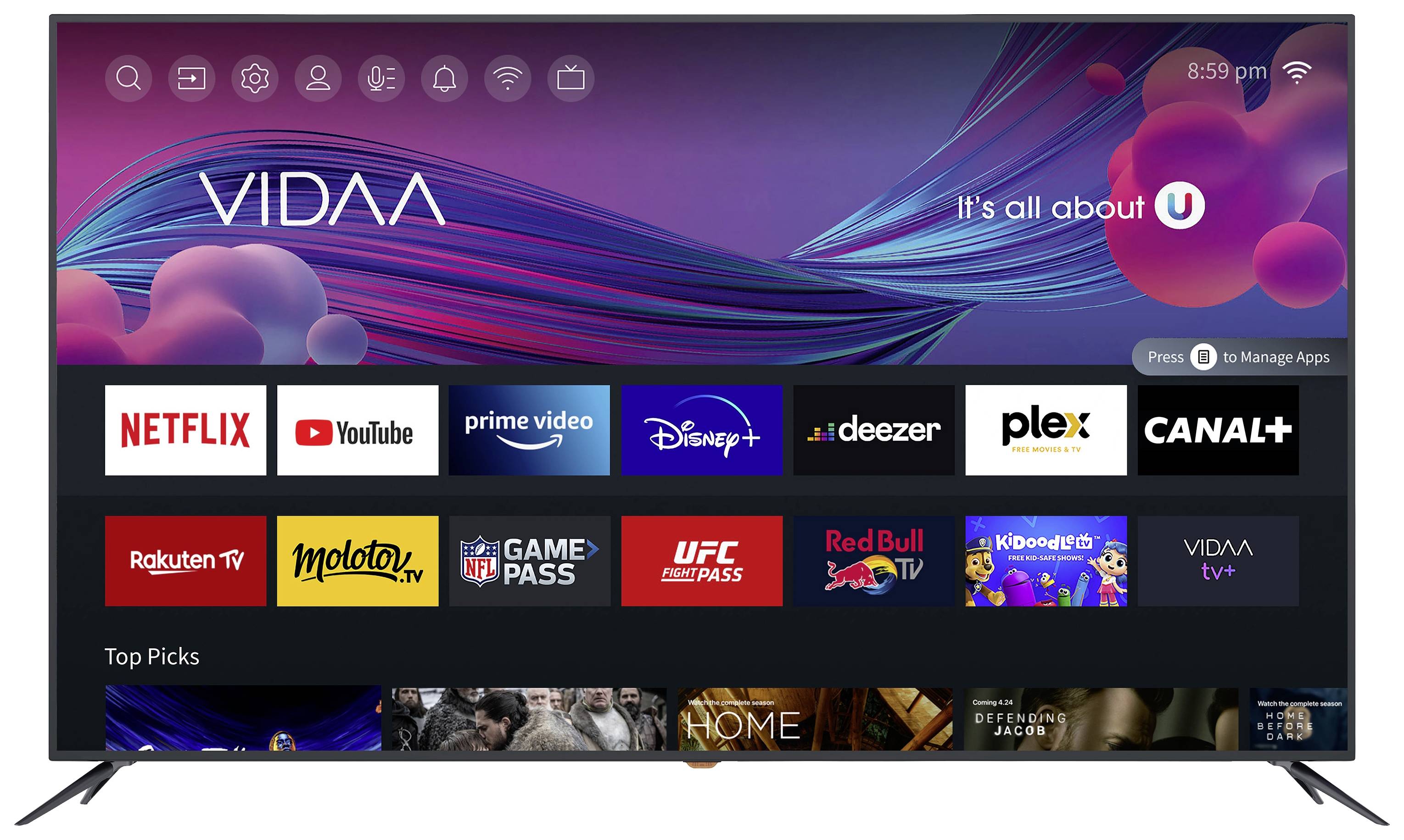 164 cm / 65 Zoll UHD SMART TV mit VIDAA Betriebssystem und Triple Tuner, UHD 3840x2160, 16:9, Triple Tuner (DVB-T2 HD, DVB-S2, DVB-C),VESA Norm (Wandhalterung) 400 x 200, 3 x HDMI (CEC, ARC), 2 x USB, RF (TV), RF (Satellit),