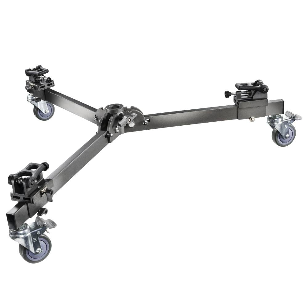 Der extrem stabile und robuste Stativwagen von mantona steht auf 3 multi-direktionalen Rollen, die auf Grund ihrer Gummibeschichtung laufruhig und leichtgängig bewegt werden können. Die Fixierung der Rollen erfolgt durch die einzeln feststellbaren Fußsperren. Er ist besonders gut geeignet für Videostative mit Doppelspikes, aber auch einfache Videostative können mittels einer Klemme festgespannt werden. Die Schnellwechselplatten sind mit Gummischlaufen versehen an denen Stative mit Doppelspikes einfach eingehakt werden können. Die darauf befestigten Arretierplatten helfen die richtige Beinwinkeleinstellung zu finden. Der Stativwagen zeichnet sich durch seine hochwertige, professionelle Qualität aus. Dank seiner robusten Bauweise ist er bis ca. 10kg belastbar. Er lässt sich durch Lösen der Arretierstifte und vorherigem Abnehmen der Adapterplatten auf eine Transportlänge von ca. 52cm zusammenklappen. Er lässt sich überall auf glatten Untergrund bewegen und ist auch für Lampenstative und Studioblitzgeräte etc. geeignet.