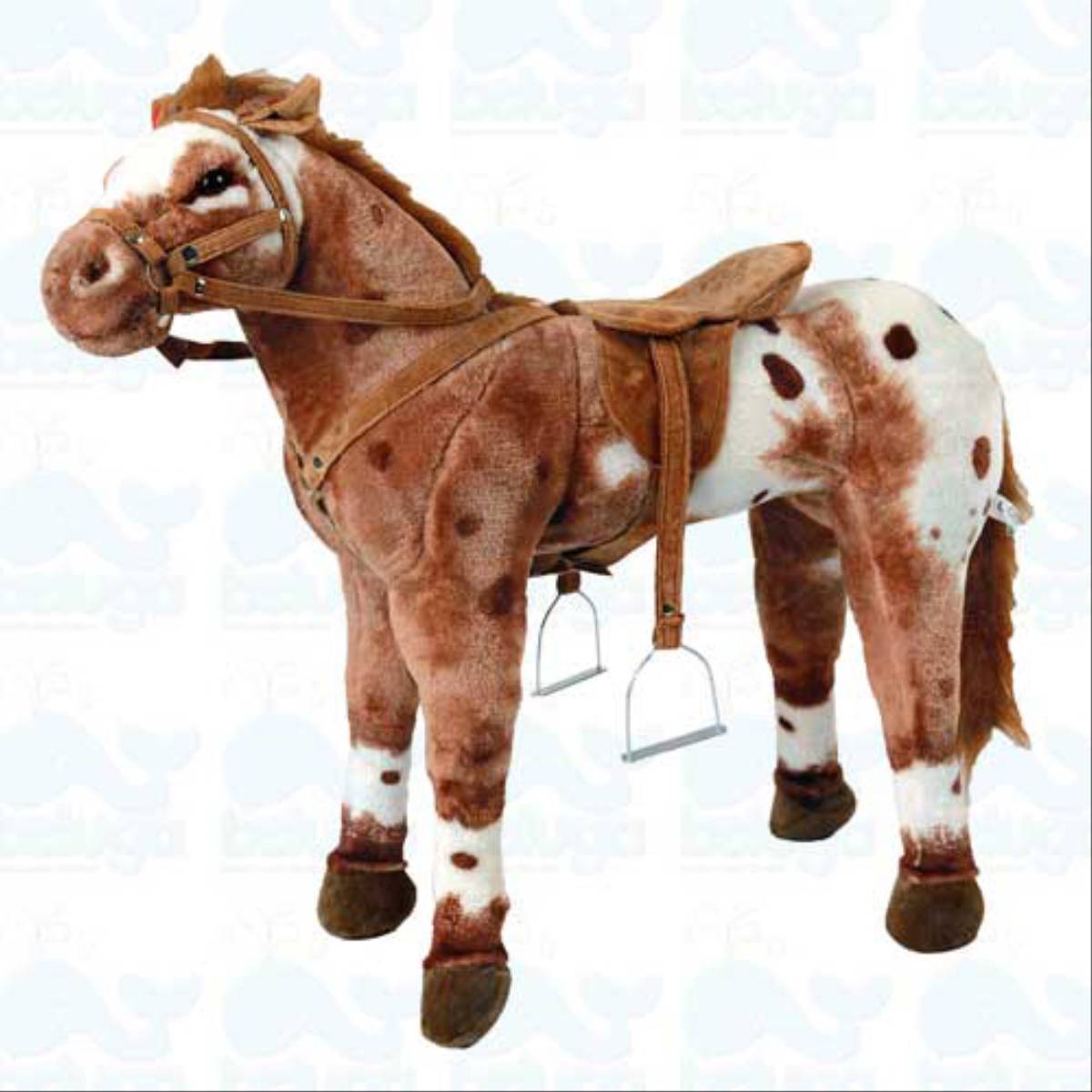 Braunes Plüschpferd mit Sattel, Steigbügel und Zaumzeug. Mit 3-fach Sound. Sitzhöhe: ca. 48 cm. Länge: ca. 75 cm. Tragkraft: ca. 100 Kg. Inkl. Batterien. Ab 3 Jahren.