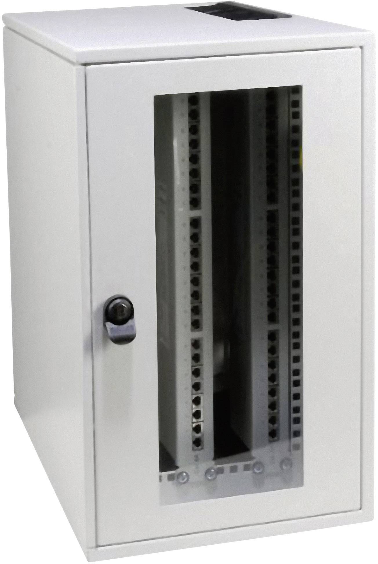 19" Wandgehäuse 5HE vertikal, 1-teilig, RAL7035, Stahlblechgehäuse 5HE vertikal, komplett vormontiert, Vordere 19" Ebene aus gestanztem Profil, Fronttür mit Sichtfenster aus zertifiziertem Sicherheitsglas, Fronttür mit Vorreiberverschluss, Linke Seitenwand ausklappbar für einfachen Zugang, Rechte Seitenwand mit Langlöchern zur Wandmontage, Rückwand verschraubt, vorbereitet zum Einbau von zwei Lüftereinheiten, Schrankteile innenseitig komplett geerdet, Zusätzlicher Erdungsbolzen M6 im Gehäuse, Dach und Boden mit vorgestanzten Ausbrüchen zur Kabeleinführung (250 x 60 mm), Lackierung: RAL7035, lichtgrau, Schutzart IP20, Inklusive Zubehör: 2 x Bürstenleiste, 1 x Käfigmutternsatz (VPE 20 Stk.), 2 x Schlüssel, Lieferung in Transportverpackung