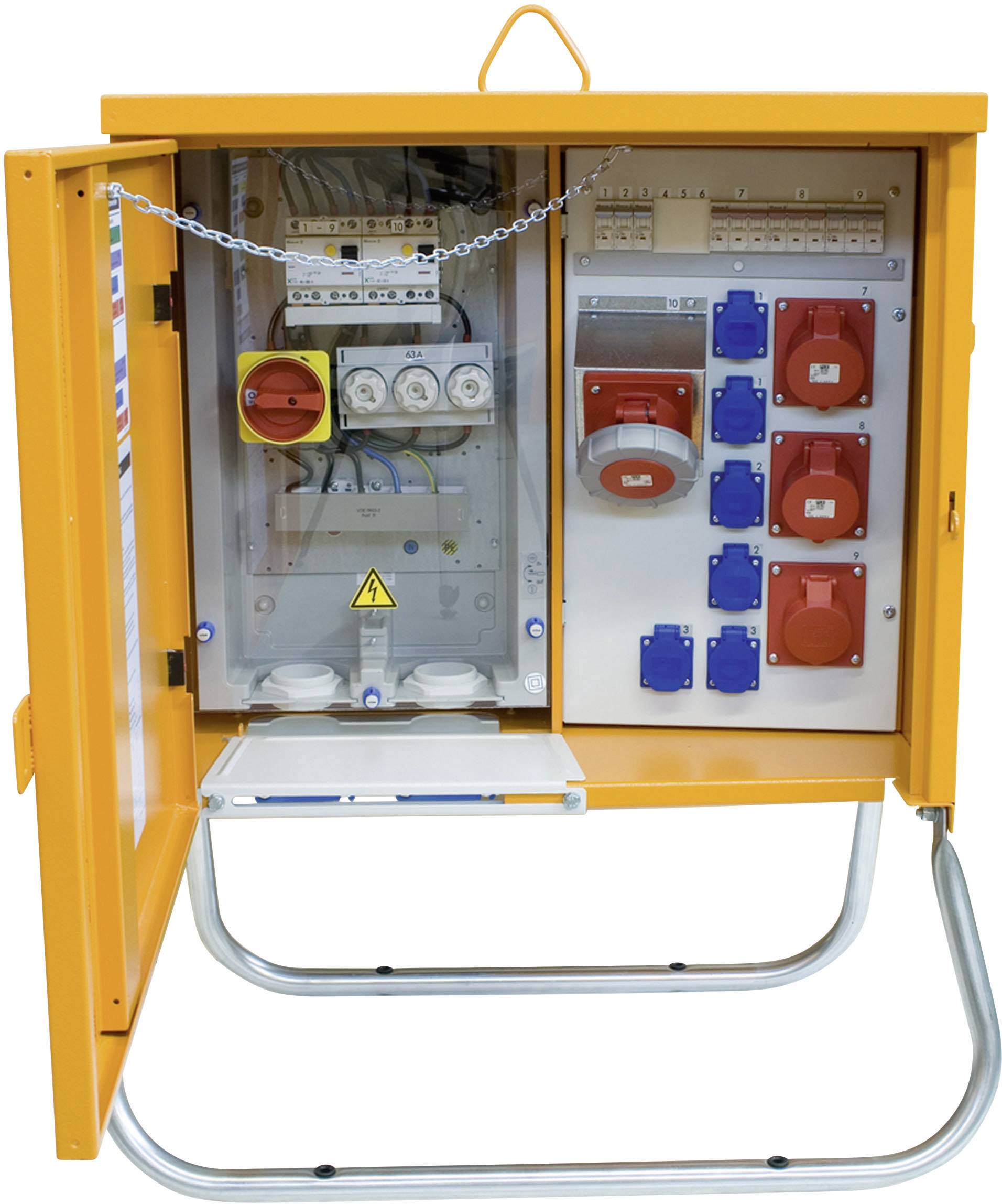 Anschlussleistung 44 kVA · Eingang über eine Klemme 35 mm², 4adrig · Ausgänge: 1 CEE-Dose 63 A, 5polig; 2 CEE-Dosen 32 A, 5polig; 2 CEE-Dosen 16 A; 6 Schutzkontakt-Steckdosen 16 A · 1 FI-Schalter 63 A, 0,3 A, über CEE 63 A-Dose; 1 FI-Schalter 63 A, 0,03 A, über restliche CEE- und Schutzkontakt-Steckdosen · Alle Einbauten schutzisoliert in Schutzart IP 54, Bedienfront in IP 21 · Verzinktes Untergestell mit Laschen für Erdnägel zur Bodenbefestigung.