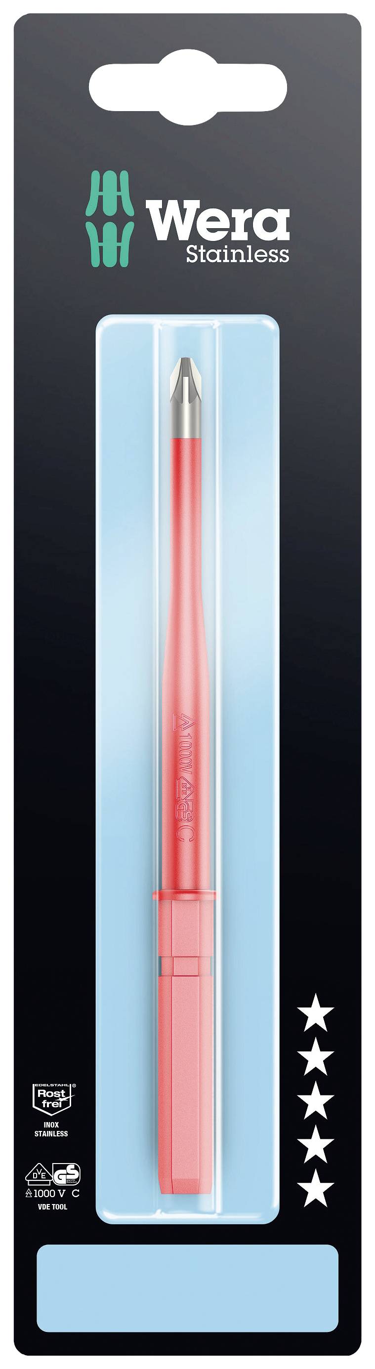 VDE Edelstahl-Wechselklinge mit reduziertem Klingendurchmesser mit integrierter Schutzisolation, so können tiefliegende Schraub- und Federelemente erreicht und betätigt werden. Stückgeprüfte Werkzeuge gem. IEC 60900. Stückprüfung bei 10.000 V für sicheres Arbeiten bei der zugelassenen Spannung von 1.000 V. Die Wera Black Point-Spitze bietet Passgenauigkeit und optimierten Korrosionsschutz. Die Edelstahlwerkzeuge von Wera sind vakuumeisgehärtet und verfügen damit über die für Verschraubungen benötigten Härten und Festigkeitswerte. Der industrielle Einsatz ist ohne Einschränkungen möglich.