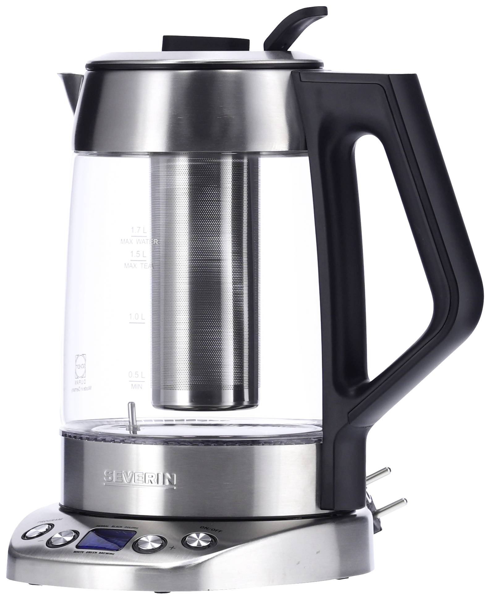 Leistung: ca. 3000 W - Kapazität: ca. 1,7 l Wasser, ca. 1,5 l Tee - Farbe: Glas-Edelstahl-gebürstet / schwarz - „Easy Tea Select“ Funktion mit 5 voreingestellten Teeprogrammen - einstellbare Temperaturstufen: 40 °C – 100 °C in 5 °C-Schritten - Temperatur und Ziehzeit individuell einstellbar - „ Be-Silent“ Funktion: Signaltöne können auf Wunsch deaktiviert/aktiviert werden - einstellbare Ziehzeit: 1 – 15 Minuten mit Signalton nach beendeter Ziehzeit - hochwertige Edelstahl-Basis mit beleuchteten Bedientasten und LED Display - hochwertiges Gehäuse aus Edelstahl und temperaturwechselbeständigem Glas - automatische Warmhaltefunktion zur 30 minütigen Temperaturspeicherung - höchste Temperaturgenauigkeit durch feinfühligen integrierten Temperatursensor - „Quick-Boil & Tea Funktion“ zur Auswahl von 100 °C oder Tee-Modus für Kräuter-Tee per einfachem Knopfdruck - leichte Reinigung durch abnehmbaren Deckel und große Öffnung - feinmaschiger Teefilter aus Edelstahl mit Griff für eine sichere Bedienung - automatische Abschaltung - 360° central-cordless-system: kabellos aus jeder Richtung auf den Gerätesockel aufsetzbar - durch Edelstahlplatte verdecktes Heizelement - Überhitzungsschutz - Ausgusszotte - rutschfeste Gummifü