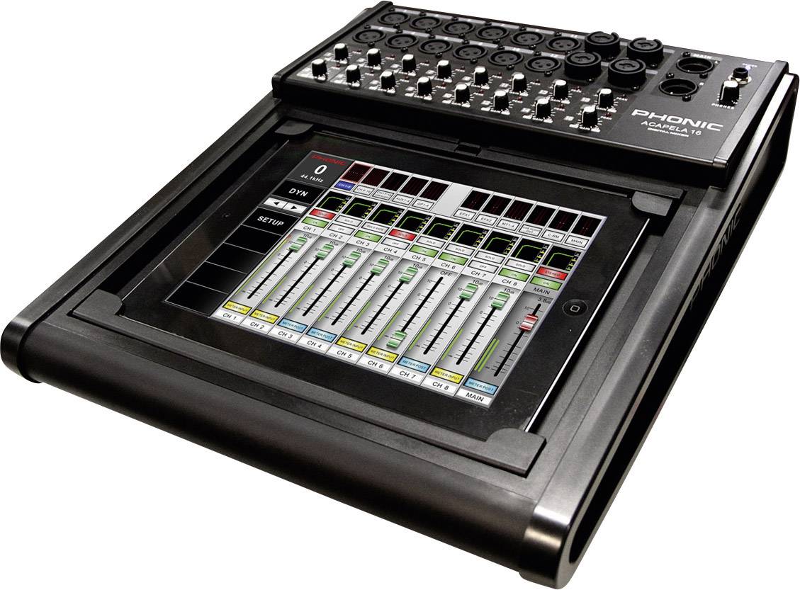 Ein neuer Standard im Bereich der digitalen Mischpulte. Das Acapela 16 vereint die bewährten Features bisheriger Phonic Digitalmixer mit einem neuen Steuerungskonzept, welches auf diesem Gebiet einen völlig neuen Maßstab setzt. Sämtliche Funktionen des Mixers können mit einem Tablet Computer (inkl. iPad und Android) bedient werden. Dafür kann das Tablet direkt am Mischpult in der entsprechenden Halterung fixiert werden oder die Bedienung erfolgt drahtlos über WiFi überall innerhalb des WLAN-Netzes. Gleichzeitig kann die Grafische Benutzeroberfläche des Mischpults auf einem VGA-Computerbildschirm sichtbar gemacht werden, die Bedienung erfolgt über eine Standard-Computermaus.