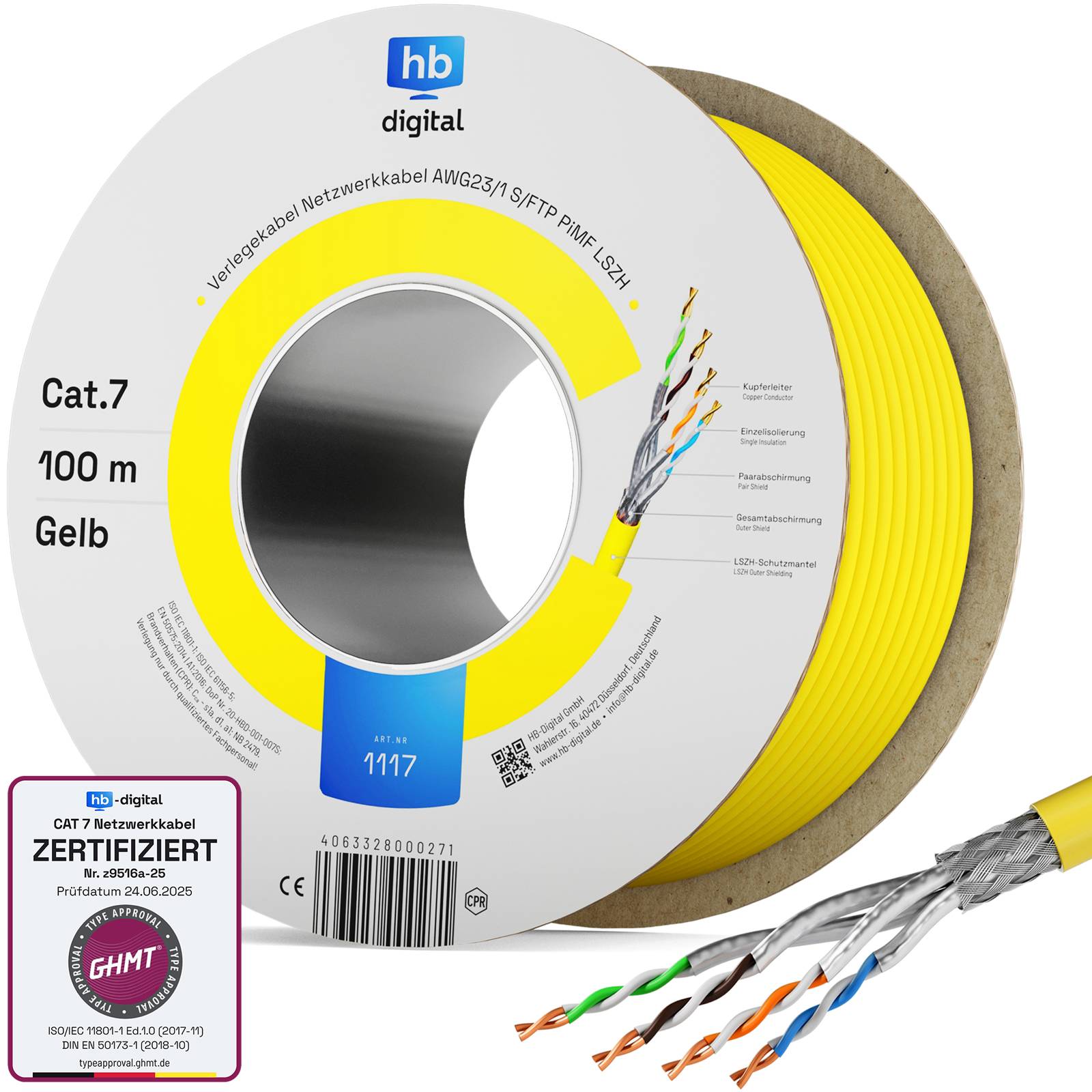 hb-digital CAT 7 Kabel 100m Netzwerkkabel Datenkabel max.1000 MHz S/FTP AWG23 LSZH gelb