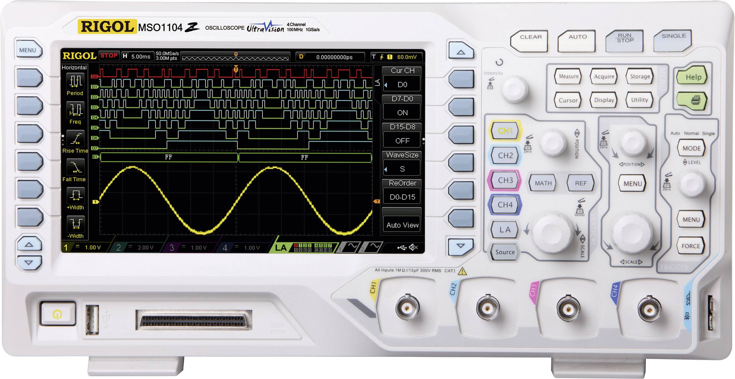 Das Modell MSO1074Z-S ist ein 70MHz 4 Kanal und 16 Digital Eingänge Mixed Signal Oszilloskop mit herausragenden Eigenschaften, wie einer sehr grossen Speichertiefe von 12 MioPkt. 17,78 cm grosses Farb-Display zur optimalen Anzeige von Messsignalen. LAN, USB und RS232 Steurung sind Standard, ebenso viele Math Funktionen. Die -S Version beinhaltet einen 2 Kanal, 25MHz Arb Funktionsgenerator.