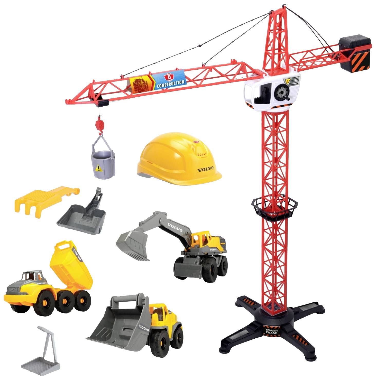 Dickie Toys - Volvo Baustellen-Spielzeug (9-teiliges Set) - für Kinder ab 3 Jahren, 1 Meter hoher Kran, 3 Baustellenfahrzeuge (Radlader, Bagger, Kipplaster), Sandspielzeug & Helm