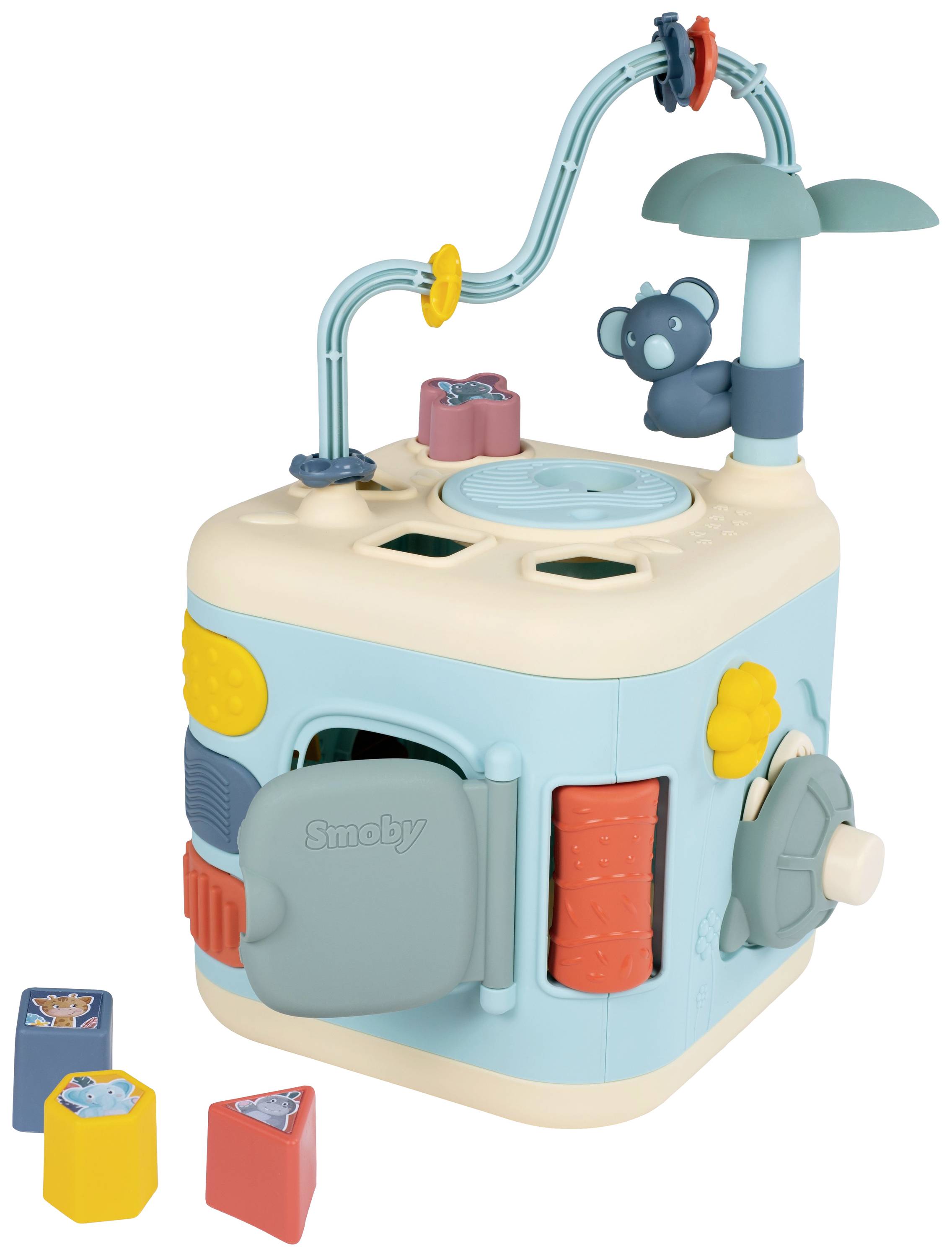 Der 5-seitige Little Smoby Motorikwürfel ist der ideale Begleiter für Kinder ab 12 Monaten: seine vielfältigen mechanischen Funktionen fördern gezielt die motorischen Fähigkeiten der Kleinen und bieten gleichzeitig jede Menge Spielspaß und Entdeckerfreude! Die mehr als 13 unterschiedlichen Spielmöglichkeiten des Activity-Würfels sorgen dafür, dass der Nachwuchs sich auf vielfältige Weise ausprobieren kann: Es gibt ein Steckspiel zum Formen sortieren, eine Motorikschleife, Zahnräder, ein Schaufelrad, einen drehbaren Koala, eine VersteckspielSchildkröte, eine Blume und einen Marienkäfer mit "Krick-Krick"-Geräusch und verschiedene Oberflächen-Strukturen zum ertasten und ergreifen. Durch die kleine Tür können die Steckspiel-Formen herausgeholt werden. Der Little Smoby Activity-Cube ist ein Produkt mit hohem Spielwert, das durch seine harmonische Farbgebung perfekt zur den aktuellen Wohntrends passt.
