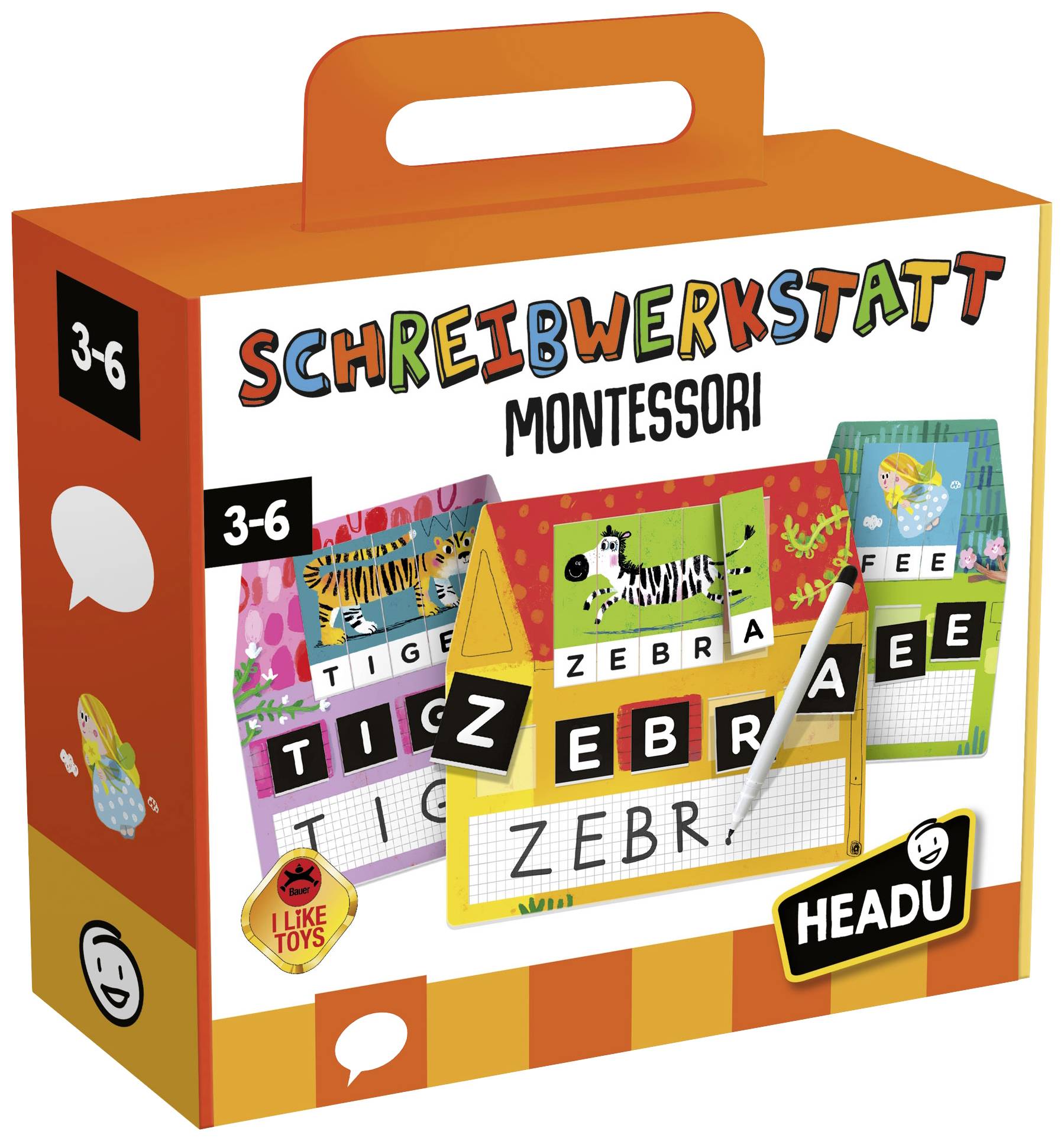 Das Lernspiel „Schreibwerkstatt Montessori – Ich lese und schreibe auf drei verschiedene Weisen!“ ist geeignet für Kinder im Alter von 3 bis 6 Jahren. Mit den besonderen Häusern setzen die Kinder die Wortpuzzles zusammen, schreiben mit den beweglichen Buchstaben und üben das freie Schreiben mit dem mitgelieferten Stift. Das Spiel orientiert sich an der Drei-Stufen-Lektion nach Montessori und unterstützt den Lernerfolg beim Lesen- und Schreibenlernen auf spannende Weise! Das Montessori-Spiel hilft Kinder Schreiben zu lernen, Wörter zu lesen, das Alphabet kennenzulernen, ihren Wortschatz zu erweitern und ihre manuelle Geschicklichkeit zu entwickeln.