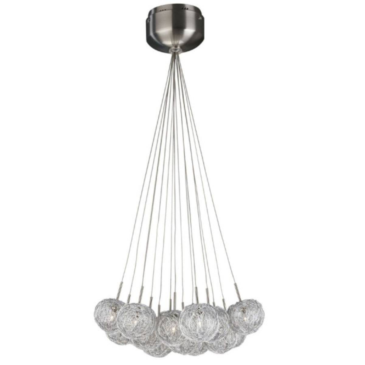 Diese Pendelleuchte zeigt fünfzehn besonders exklusive Leuchtenköpfe, die scheinbar mit feinster Glaswolle gesponnen wurden. Aus dieser natürlichen Opulenz heraus entfaltet sich eine prächtige Lichtwirkung, die den Glanz dieser Leuchte zusätzlich unterstreicht. Selbstverständlich will der Einsatzort dieser Innenleuchte wohl bedacht sein; offene, klare Räume etwa eignen sich hervorragend, um diese Pendelleuchte zu beherbergen.