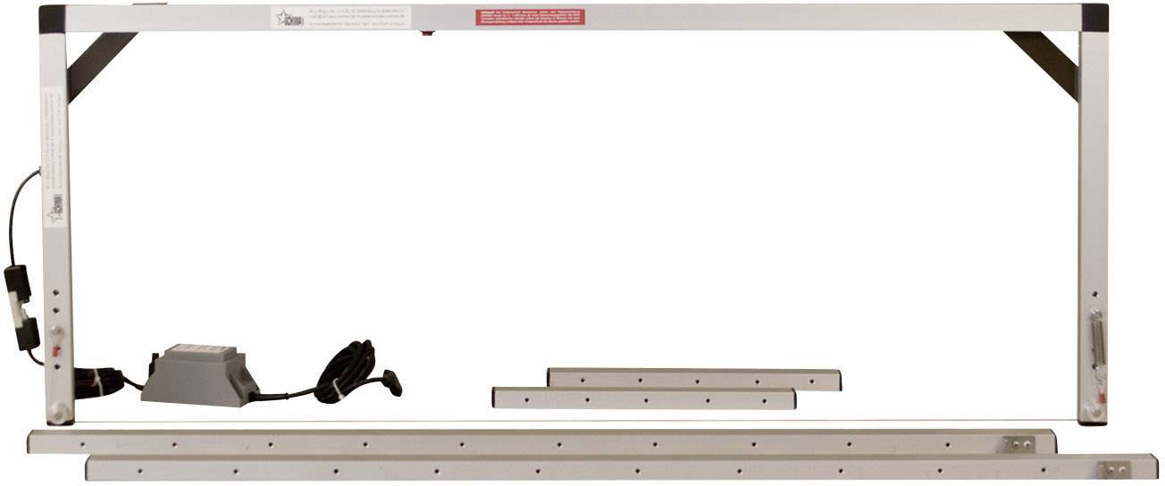 2 kurze Führungsschienen · 2 lange Führungsschienen · Sicherheitstrafo VDE 0570 mit Thermosicherung: 24 V - 60 Watt - 3 A · Stabile Eckverbindungen mit Metallkern · Eloxierte Aluteile · Inklusive 3 Ersatzdrähte.