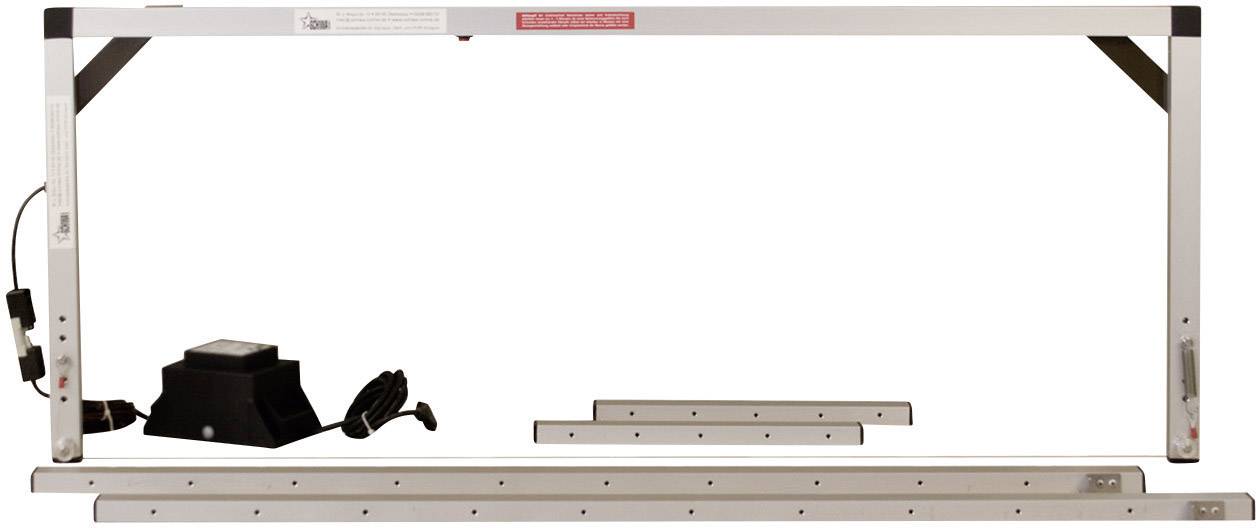 2 kurze Führungsschienen · 2 lange Führungsschienen · Sicherheitstrafo VDE 0570 mit Thermosicherung: 24 V - 60 Watt - 3 A · Stabile Eckverbindungen mit Metallkern · Eloxierte Aluteile · Inklusive 3 Ersatzdrähte.