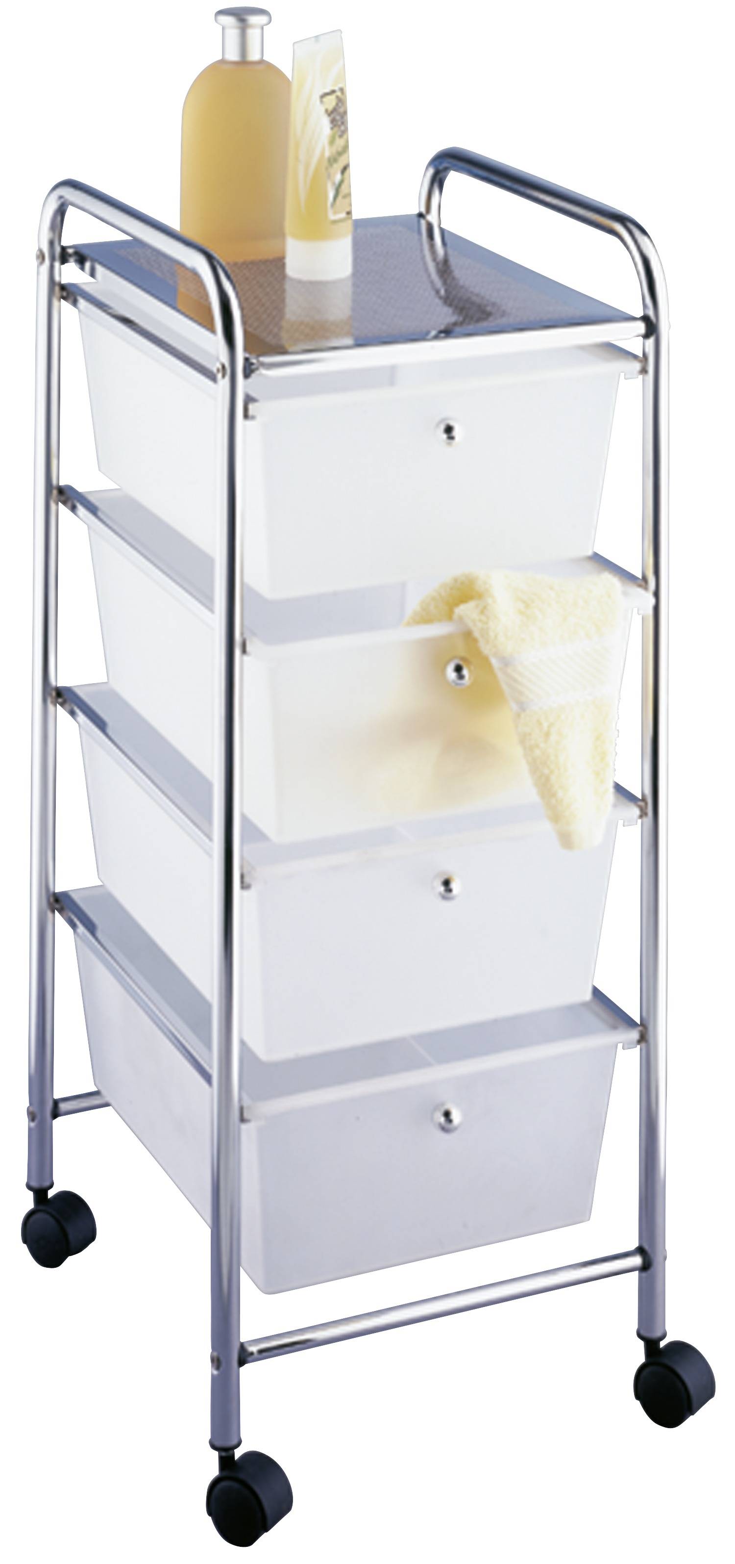 Mit vier ausziehbaren Schubladen aus weiß transparentem Kunststoff bietet er viel Platz und Stauraum zur Aufbewahrung von Kosmetik- und Badutensilien sowie dekorative Stellmöglichkeiten auf der oberen Ablage für Haushalt- oder Bad-Accessoires.