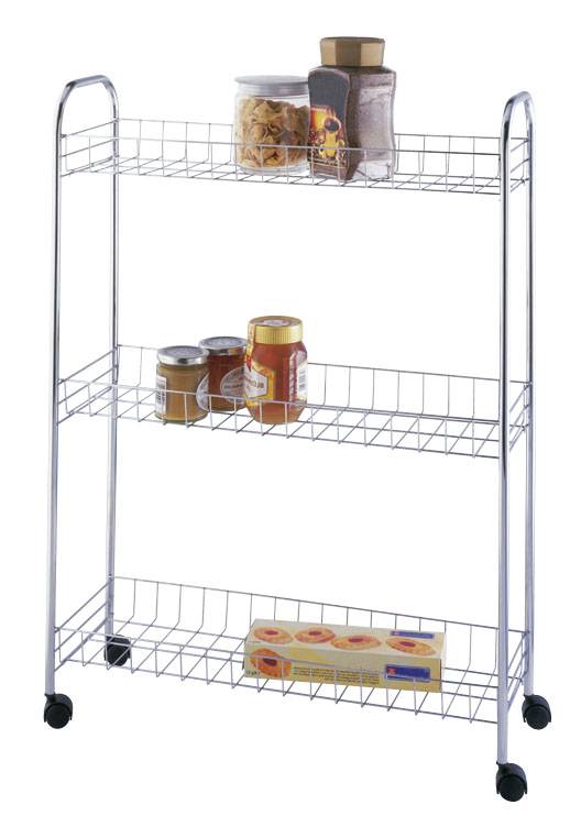 Dieses für schmale Zwischenräume konzipierte Rollregal in Chrom-Optik nutzt bisher offene Lücken zwischen Waschmaschine und Wand oder Küchenbord und Wand optimal aus.