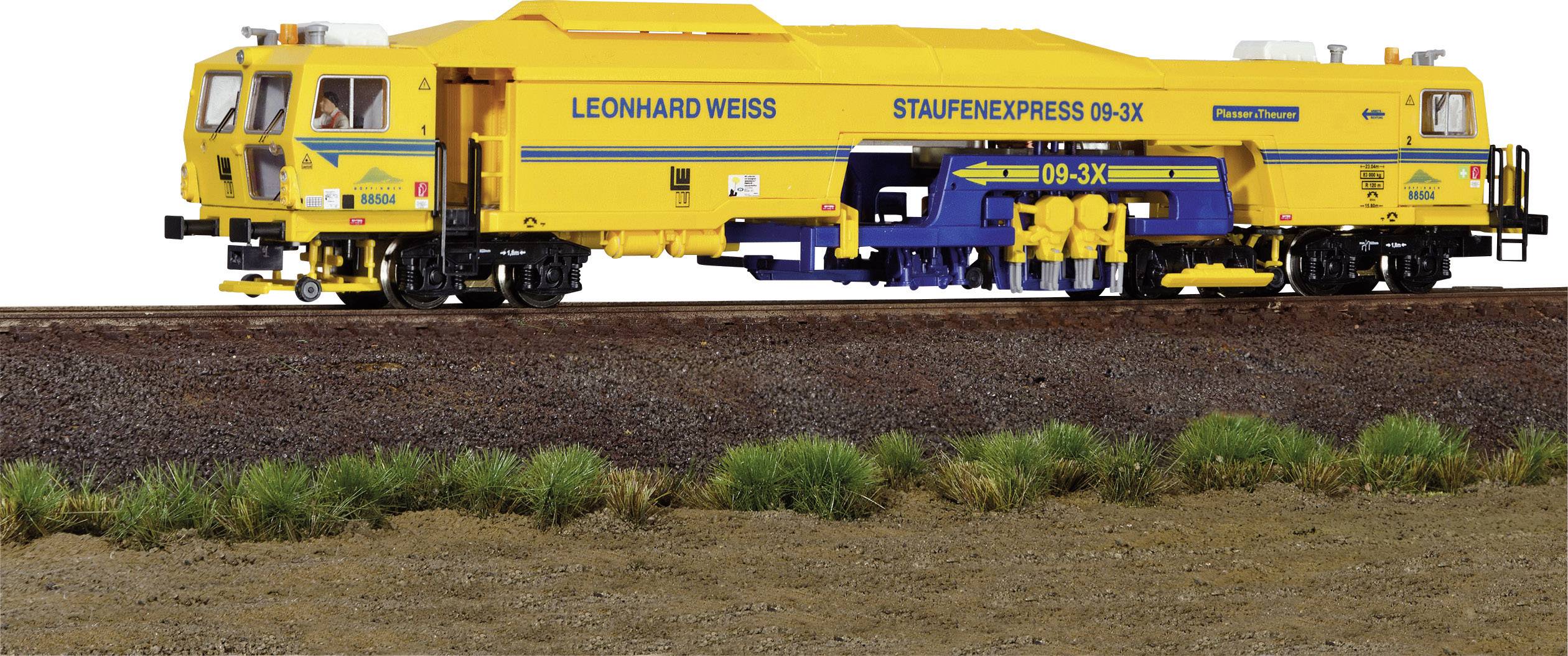 Bauzug zur Schotteraufarbeitung von Plasser & Theurer · Mit elektrischem Antrieb · Lichtwechsel, Warnblinkleuchten und Arbeitsraumbeleuchtung mit LEDs · Sound · RailCom-fähiger Decoder für Analog- und Digitalbetrieb · Verschiedene Funktionen der Stopfeinheit · Fahr- bzw. Arbeitsmodus · Funktionsumfang im Analogbetrieb: Fahren, Arbeitsmodus, Sound (Lautstärke regelbar) · NEM-Kupplungsschacht · Kurzkupplungs-Kinematik.