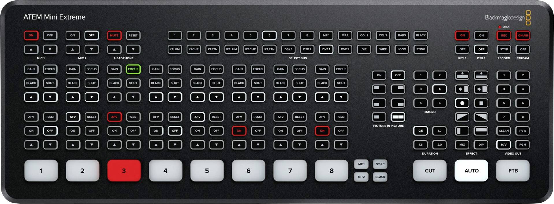 ATEM Mini Extreme Dieses Modell ist ein erweiterter Mischer für echte Profis! Sie profitieren von allen Funktionen des ATEM Mini Pro und erhalten obendrein acht HDMI-Eingänge, zwei separate HDMI-Ausgänge, zwei USB-Ports und eine Kopfhörerbuchse. Außerdem verfügt dieses Modell über vier Chromakeyer, sechs DVE für Bild-im-Bild-Darstellungen, zwei Mediaplayer und einen Multiviewer für bis zu 16 Ansichten.