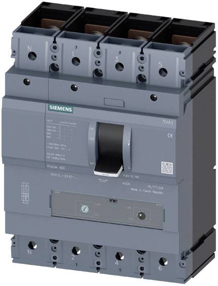 Leistungsschalter 3VA1 IEC Frame 400 Schaltvermögenklasse H Icu=70kA @ 415V 4-polig, Anlagenschutz TM240, ATAM, In=320A Überlastschutz Ir=224A...320A Kurzschlussschutz Ii=5...10 x In N-Leiter ungeschützt Schraubenflachanschluss Kompaktleistungsschalter 3VA1 für Starterschutz. Die Kompaktleistungsschalter 3VA von Siemens als wichtiger Bestandteil der SENTRON Schutzkomponenten für industrielle Anwendungen sowie für Anwendungen im Infrastrukturbereich bieten effektiven Anlagen -, Starter- und Motorschutz durch sicheres Abschalten im Überlast- und Kurzschlussfall. Die Kompaktleistungsschalter 3VA setzen dabei Maßstäbe in Flexibilität und modularer Zubehörvielfalt. Einheitliches Zubehör für mehrere Baugrößen über alle Baureihen des Kompaktleistungsschalters 3VA1 und 3VA2. Diese Variante des Kompaktleistungsschalters 3VA zeichnet sich vor allem aus durch: 1. Kompakte Bauform. 2. Verfügbar als Variante für Starterschutz zur Absicherung von elektrischen Motoren gegen Kurzschluss. 3. Verfügbar als 3-polige Ausführung. 4. Abhängig von der Baugröße: Bemessungsbetriebsstrom von 32 A....200 A. 5. Schaltvermögen von 55 kA ... 70 kA bei 415 V. 6. Montage in Festeinbau und Stecktechnik möglich. 7. Die Baureihe verfügt über einen Thermisch-magnetischer Überstromauslöser 8. Modulares und einfach zu montierendes internes Zubehör mit vielfältigen Funktionen. 9. Durchgängige Zubehörplattform über alle Kompaktleistungsschalter 3VA.