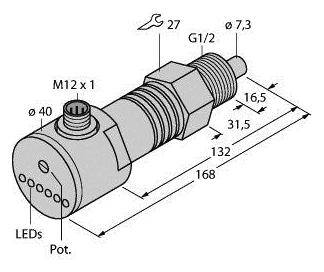 Strömungsüberwachung, Eintauchsensor mit integrierter Auswerteelektronik, Eintauchsensor, Sensor für flüssige Medien, kalorimetrische Funktionsweise, Abgleich über Potenziometer, Anzeige via LED-Kette, Temperaturbereich: 0...+100 °C (kurzzeitig bis +120 °C bei Umgebungstemperaturen < 40 °C), DC 3-Draht, 19,2...28,8 VDC, Schließer, PNP-Ausgang, Steckergerät, M12 x 1