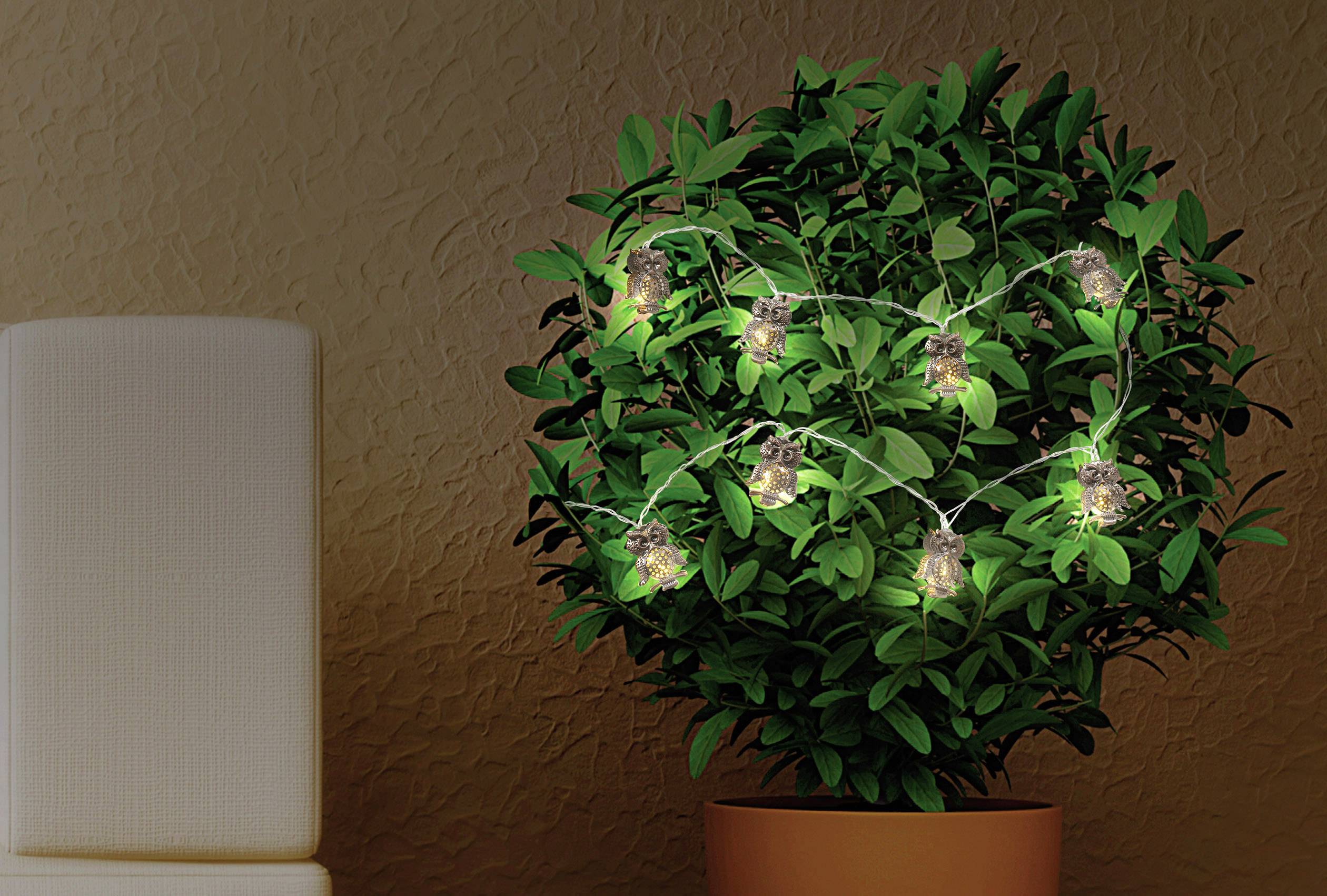 Eulen sind Symbole für Klugheit und Weisheit. Verschönern Sie mit dieser 1,55 m langen Lichterkette Ihr Bücherregal oder Ihre Leseecke. Auch Kinder finden bestimmt diese Eulenlichterkette im Kinderzimmer "zauberhaft".
