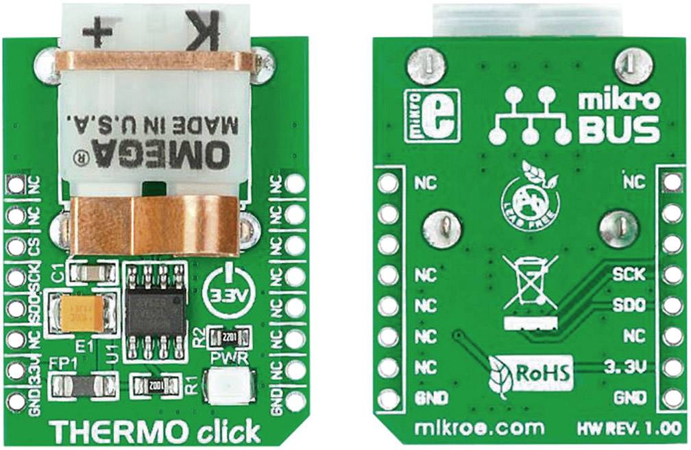 THERMO Click™ ist eine Zubehörplatine im mikroBUS™ Formfaktor. Sie enthält den MAX31855K Thermoelement-zu-Digital Wandler und eine PCC-SMP-Verbindung für K-Typen-Thermoelementsonden.